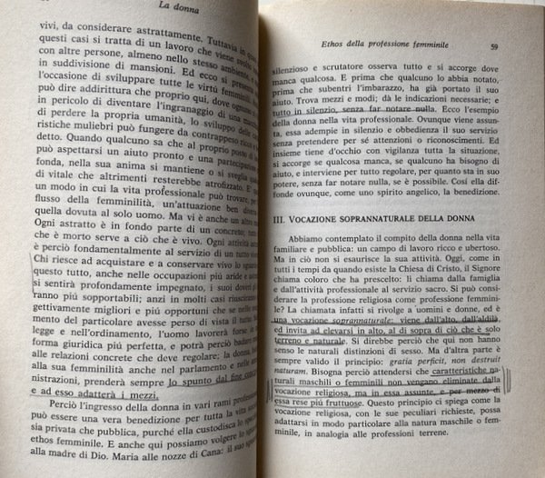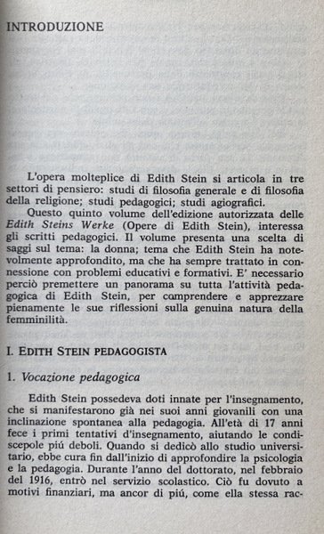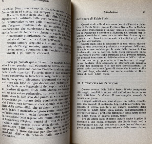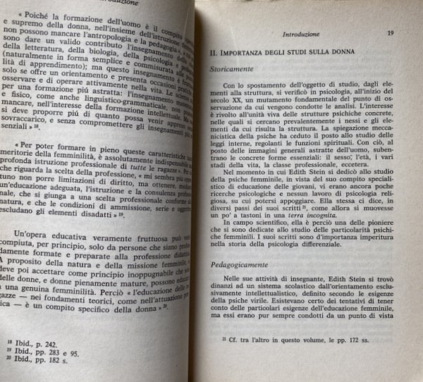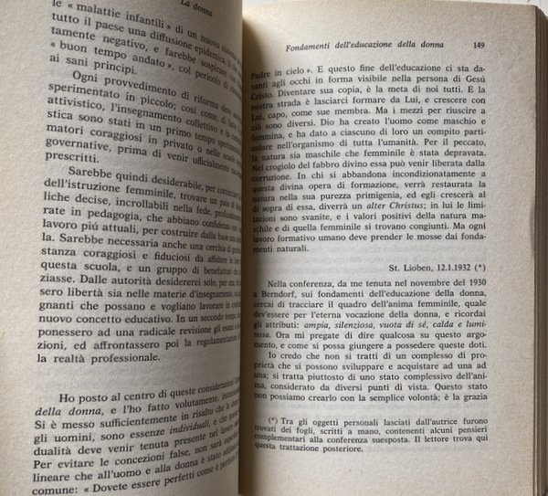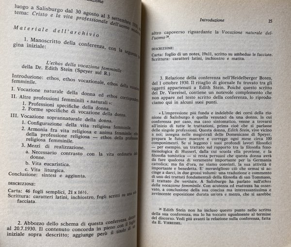 Soggetti: Religione, Cristianesimo, Teologia cristiana, Filosofia delle religioni, Intersoggettività, Chiesa cattolica romana, Antropologia comunionale e relazionale, Ethos, Etica, Lavoro, professioni, Conferenze, Ruolo della donna, Società, Studi di genere, Donne, Grazia, Natura, Rivelazione biblica, Insegnamento ecclesiale, Tratti tipici, Biologia, Corpo, Aspetti psichici, Spiritualità, Specie umana, Antropologia duale, Angela Ales Bello, Differenza, Unità, Maschile, Femminile, Evdokimov, Reciprocità, Comunione, Relazioni uomo-donna, Santa Teresa Benedetta della Croce, Difetti, Vizio, Sesso femminile, Husserl, Sante, Santi, Beati, Concezione cristiana, La mujer: su naturaleza y Misión, Essential Writings, Empatia, Filosofia, Ontologia, Fenomenologia, Pensieri, Martin Heidegger, Werke, Bugie, Personalità, Scheler, Forza vitale, Psicologia, Estetica, Pensiero estetico, Mistica, Scritti, Dio, Cristo, Altruismo, Sensibilità, Intuito, Liberazione, Sottomissione, Mentalità, Emancipazione, Lotte politiche, Movimenti femministi, Novecento, Canone maschile, Stereotipi, Prepotenza, Violenza, Pedagogia, Scritti pedagogici, Vocazione naturale, Soprannaturale, Vita eucaristica e liturgica, Educazione, Formazione, Trattato pedagogico, Didattica, Armonia, Religione, Chiesa, Cristo, Ragazze, Psicologia, Idealismo, Saggi, Articoli, Libri Vintage Fuori catalogo, Collezionismo, Raccolte, Archivio, Conferenze, Viereisel, San Tommaso d'Aquino, De Veritate, Dio, Anima femminile, Verginità, Castità, Maternità, Letteratura, Ibsen, Nora, Attività, Goethe, Ifigenia, Figure storiche, Gioventù, Casa, Scuola, Accademie cattoliche, Svizzera, Inghilterra, Europa, Matrimonio, Famiglia, Stato, Diritti sociali, Parità, Mistero, Libri rari, Religion, Christianity, Christian theology, Philosophy of religions, Intersubjectivity, Roman Catholic Church, Communal and relational anthropology, Ethics, Jobs, Professions, Conferences, Role of women, Society, Gender studies, Women, Grace, Nature, Biblical revelation, Teaching Ecclesial, Typical traits, Biology, Body, Psychic aspects, Spirituality, Human species, Dual anthropology, Difference, Unity, Male, Female, Reciprocity, Communion, Man-woman relationships, Defects, Vice, Female sex, Saints, Blessed, Christian conception, Empathy, Philosophy, Ontology, Phenomenology, Thoughts, Lies, Personality, Life force, Psychology, Aesthetics, Aesthetic thinking, Mystical, Writings, God, Christ, Altruism, Sensitivity, Intuition, Liberation, Submission, Mentality, Emancipation, Struggles politics, Feminist movements, Twentieth century, Male canon, Stereotypes, Arrogance, Violence, Pedagogy, Pedagogical writings, natural vocation, supernatural, Liturgical Life, Education, Training, Pedagogical Treatise, Didactics, Harmony, Religion, Church, Christ, Girls, Psychology, Idealism, Essays, Articles, Out of print books, Collectibles, Collections, Archives, Conferences, St. Thomas Aquinas, God, Female soul, Virginity, Chastity, Maternity, Literature, Activity, Iphigenia, Historical figures, Youth, Home, School, Catholic academies, Switzerland, England, Europe, Marriage, Family, State, Social rights, Equality, Mystery, Rare books