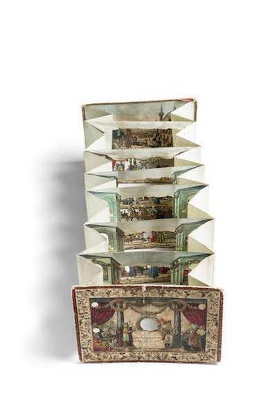 Oblong 8vo (168 x 228 mm). Hand-coloured lithographed upper cover and 7 hand-coloured lithographed scenes bound concertina-style and extending to approximately 850 mm. A fine example of a peepshow, consisting of six cut-away scenes and one back scene on the inside of the lower cover. When viewed through the holes in the upper cover, a lively, three-dimensional scene is revealed, a festival crowd in a long street of Constantinople, terminating at the port. - "Paper peepshows developed out of sturdier 18th-century peepshows, in which views were slid at regular intervals into a rigid box made of wood or cardboard, with the peephole located at one end. In the example below, several scenes have been combined into a larger frame. The layered structure of the peepshow was inspired by Baroque stage sets where the decor was painted onto a series of parallel planes that moved along grooves set in the stage" (Victoria & Albert Museum). - Some soiling and wear to cover, bellows intact, minor damage to a few figures, minor spots of toning. An intact example of a fragile piece. No copies recorded in OCLC. - Hyde, Gestetner Collection, 103.