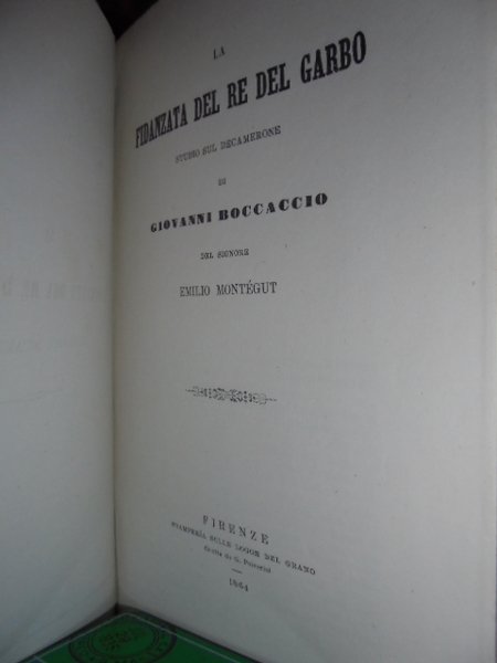 Montégut, Emilio - Firenze, G. Polverini, 1864. La fidanzata del Re del Garbo. Studio sul Decamerone di Giovanni Boccaccio. In-8°, br., cop. muta. 21 pp. Opuscolo ben conservato. Neg. Mob 6