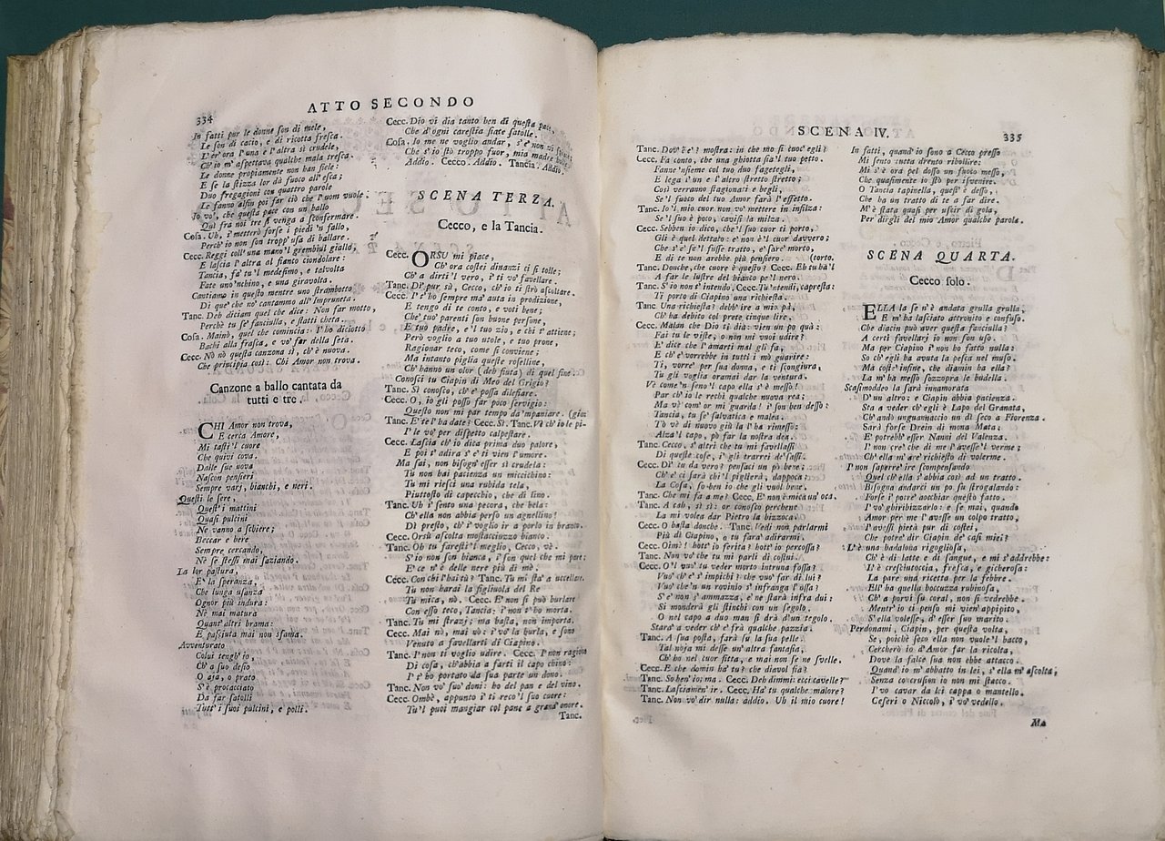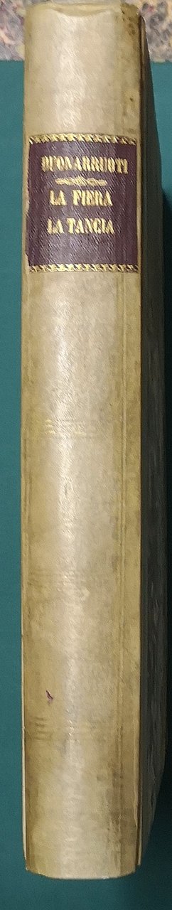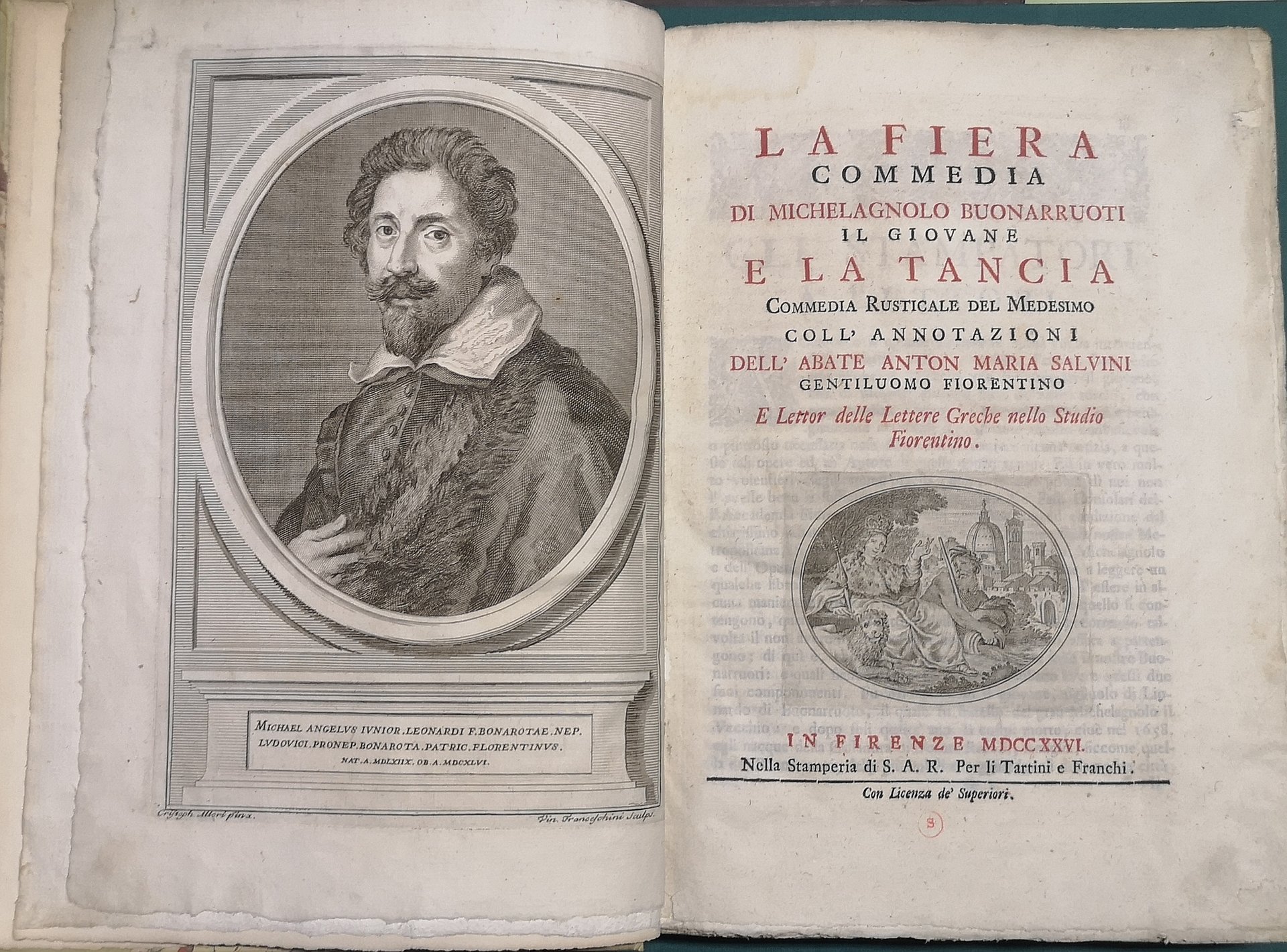 >in-folio, pp. XVI, 603, (1), leg. m. pergamena ed angoli, titolo in oro su tassello al dorso. Titolo in rosso e nero, ritratto in ovale inciso a piena pag. in antiporta. Prima edizione, assai pregiata, della Fiera, commedia in versi divisa in XXV Atti e in cinque Parti, da recitarsi in altrettanti giorni. Colma di bei modi di dire toscani e di gerghi contadineschi, fu rappresentata in Firenze nel Carnevale del 1618. La Tancia inizia a pag. 321 del volume ed è qui in seconda edizione, essendo stata già pubblicata dai Giunti nel 1612; è una commedia rusticale in cinque atti in ottave, rappresentata nel 1611 alla presenza dei Granduchi in Firenze. ''La Tancia è cosa fresca, scintillante di arguzia, di vivacità, di forza drammatica, scritta in un linguaggio tutto colore...'' (Diz. Bompiani). Le due commedie di Michelangelo Il Giovane (1568-1642) sono considerate i capolavori della drammaturgia italiana del Seicento. Buon esemplare, freschissimo e marginoso (lieve alone al margine inferiore dei primi fogli). Allacci 343-345. Soleinne 4642. Gamba 253: ''pregevolissima edizione''.