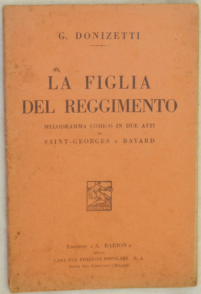 In 16. Dim. 18,5x12,5 cm. Pp. 31. Bel libretto d'opera del 1937 dell'opera "La figlia del reggimento" di Gaetano Donizetti (1797-1848) su libretto di Saint Georges e Bayard. La prima rappresentazione ebbe luogo al Teatro della Scala di Milano il 3 ottobre 1840 In buone condizioni. Bella brossura editoriale illustrata. Brossura editoriale in buone condizioni generali con lievi usure ai margini e dorso; macchie. Legatura in buone condizioni. All'interno le pagine si presentano in buone condizioni con fioriture.Beautiful booklet of 1937 of the work in three acts "La figlia del reggimento" by Gaetano Donizetti (1797-1848) on booklet by Saint Georges e Bayard. The first representation took place in the Teatro alla SCala of Milan the 3rd of october 1840. In good conditions. Editorial cover in good general conditions slightly worn in the edges and spine. Stains. Binding in good conditions. Inside pages are in good conditions with foxings.