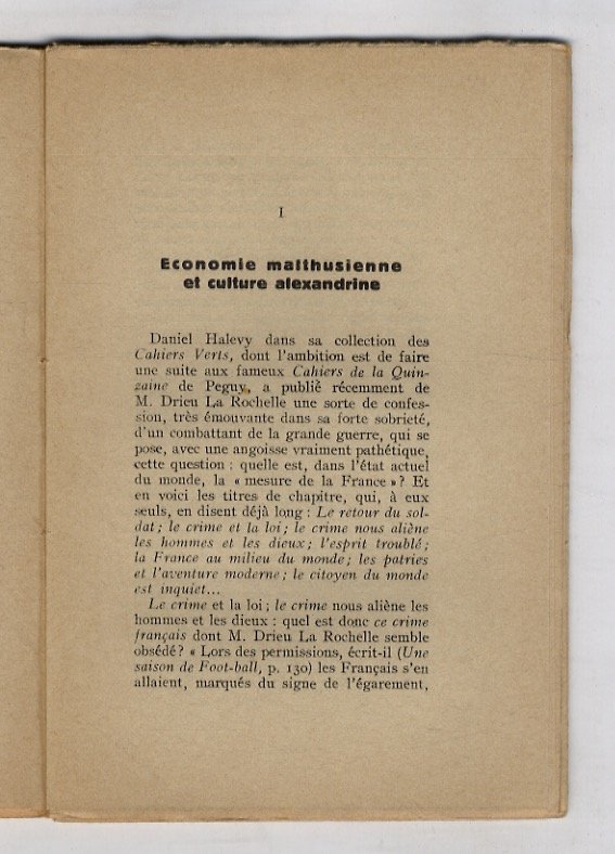 Torino, Piero Gobetti, 1924, in-8 piccolo, br. editoriale, pp. 36, [4]. Prima edizione. L’allievo di Sorel, Édouard Berth (1875-1939) fu in corrispondenza con Gobetti tra il 1922 e il 1925 e collaborò alle sue riviste. Condivise con lui la difesa della rivoluzione d’ottobre, l’interesse per i consigli operai torinesi e l’ammirazione nei confronti di Sorel, che rimase totale in Berth, mentre Gobetti ne vide luci ed ombre. Per tutti e due si trattava di sottrarlo ai tentativi di appropriazione fascista. In "La France au milieu du monde", pubblicato dall’editore torinese nel 1924, Berth raccoglieva tre articoli comparsi l’anno prima sulla «Rivoluzione Liberale» a proposito di un libro di Pierre Drieu La Rochelle. Eccellente esemplare. Raro.
