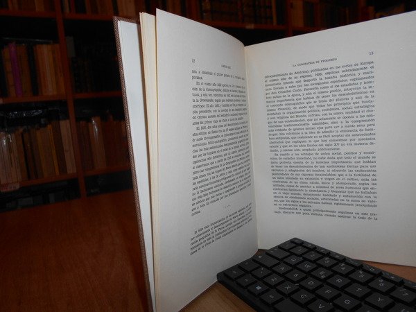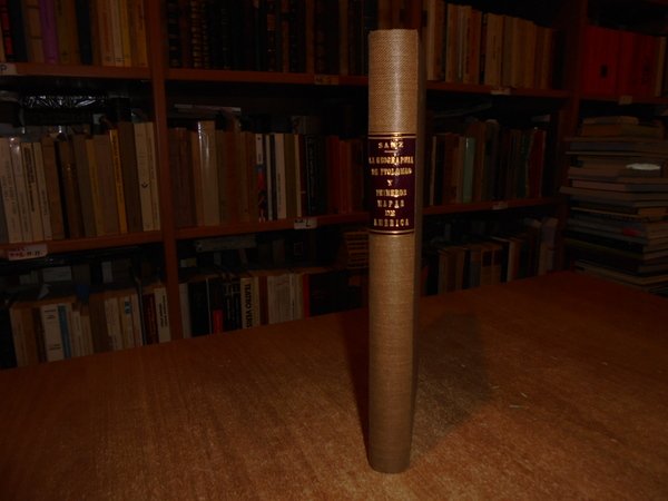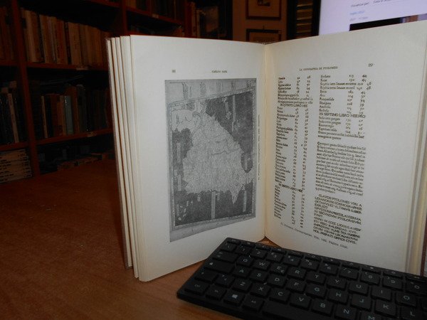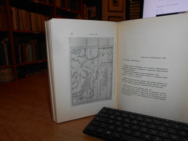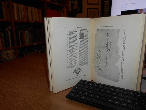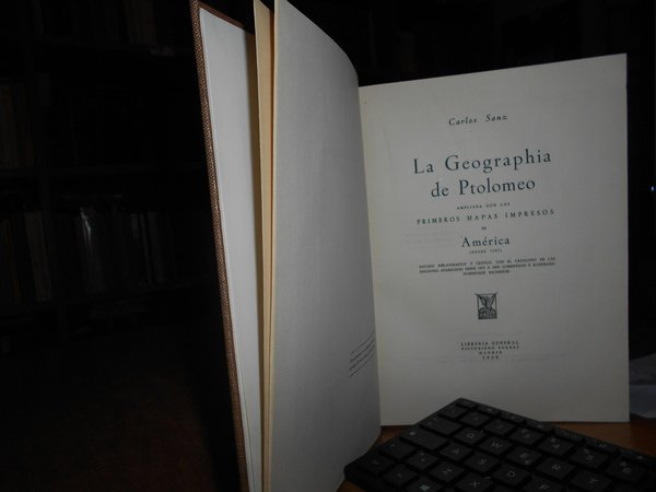 CARLOS SANZ. Madrid, Libreria General Victoriano Suarez, 1959. La Geographia de Ptolomeo ampliada con los primeros mapas impresos de América (desde 1507). Estudio Bibliografico y critico con el catalogo de las ediciones aparecidas desde 1475 a 1883. Comentado e illustrado numerosos facsimiles. In-8°, tela con titolo in oro entro tassello al dorso, copertine originali conservate. 281, (1) pp. con numerosi facsimili. Ottimo esemplare in legatura recente con le brossure originali conservate. Uff. B - I - 6 - 2