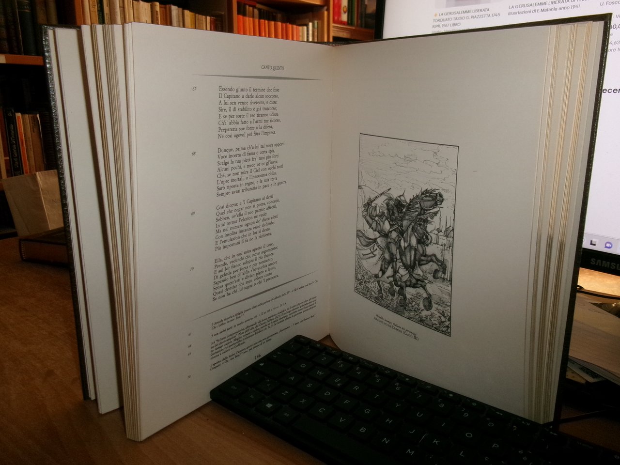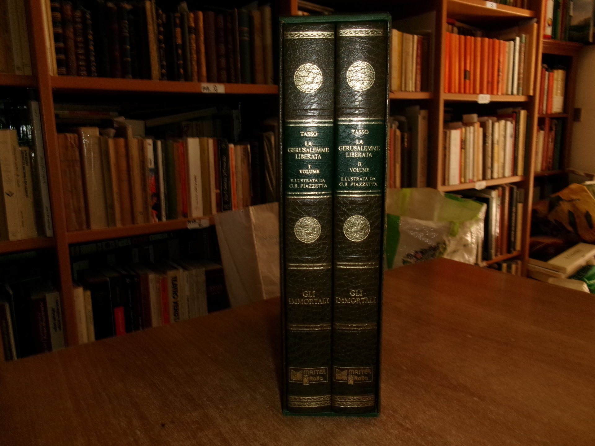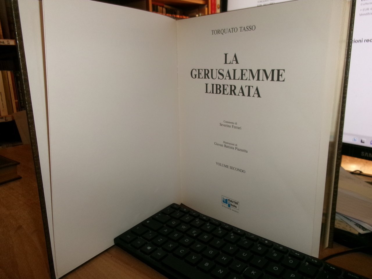 TORQUATO TASSO. La Gerusalemme Liberata. Milano, Editoriale Del Drago, 1992. Commento di Severino Ferrari. 2 volumi in-4°, bella legatura in similpelle con decori in oro, tagli dorati. Per complessive 574,(1) pp. con numerose tavole e illustrazioni n.t. di Giovan Battista Piazzetta. Ottimo esemplare in cofanetto rigido. Uff. stanzetta TV mob. nostro