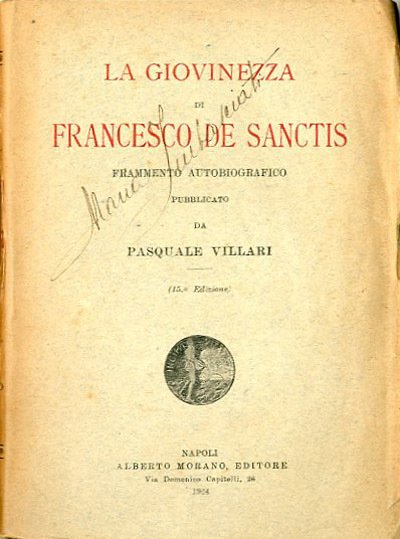 15. ed. XIX, 382 p. ; 19 x 14 cm. La giovinezza è un'autobiografia di Francesco De Sanctis (1817-1883) - scrittore, critico letterario, politico, Ministro della Pubblica Istruzione e filosofo italiano -, dettata dall'autore negli ultimi due anni di vita alla nipote Agnese, e pubblicato postumo a cura di Pasquale Villari nel 1889 col titolo La giovinezza: frammento autobiografico. Brossura editoriale, coperta in cartoncino flessibile con impresso il titolo in rosso al piatto e in nero al dorso. Segni del tempo al dorso e alle pagine interne (ingiallimento della carta), nel complesso libro accettabile, da studio. Firma di appartenenza nella coperta. Codice libreria 4879.