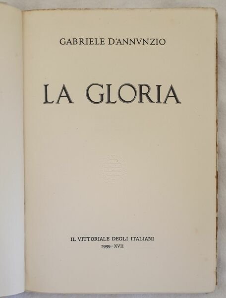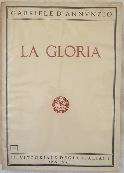 Edizione del 1939 della tragedia "La gloria" dello scrittore, poeta, drammaturgo, politico e giornalista Gabriele D'Annunzio (1863-1938). Volume n. 22 della collana edita dalla fondazione "Il Vittoriale degli italiani". Firma alla prima carta bianca. In ottime condizioni. Brossura editoriale in ottime condizioni generali con lievi usure ai margini e dorso. Legatura in buone condizioni. All'interno le pagine si presentano in ottime condizioni con rare fioriture. In 8. Dim. 22,5x16,5 cm. Pp. 144+(1). Edition of 1939 of the tragedy "La gloria" by the writer poet dramawriter politician and journalist Gabriele D'Annunzio (1863-1938). Volume n. 22 of the series edited by the fondation "Il Vittoriale degli italiani". In very good conditions. Editorial cover in very good general conditions slightly worn in the extremities. Binding in good conditions. Inside pages are in very good conditions with occasional foxing. In 8. Dim. 22,5x16,5 cm. Pp. 144+(1).