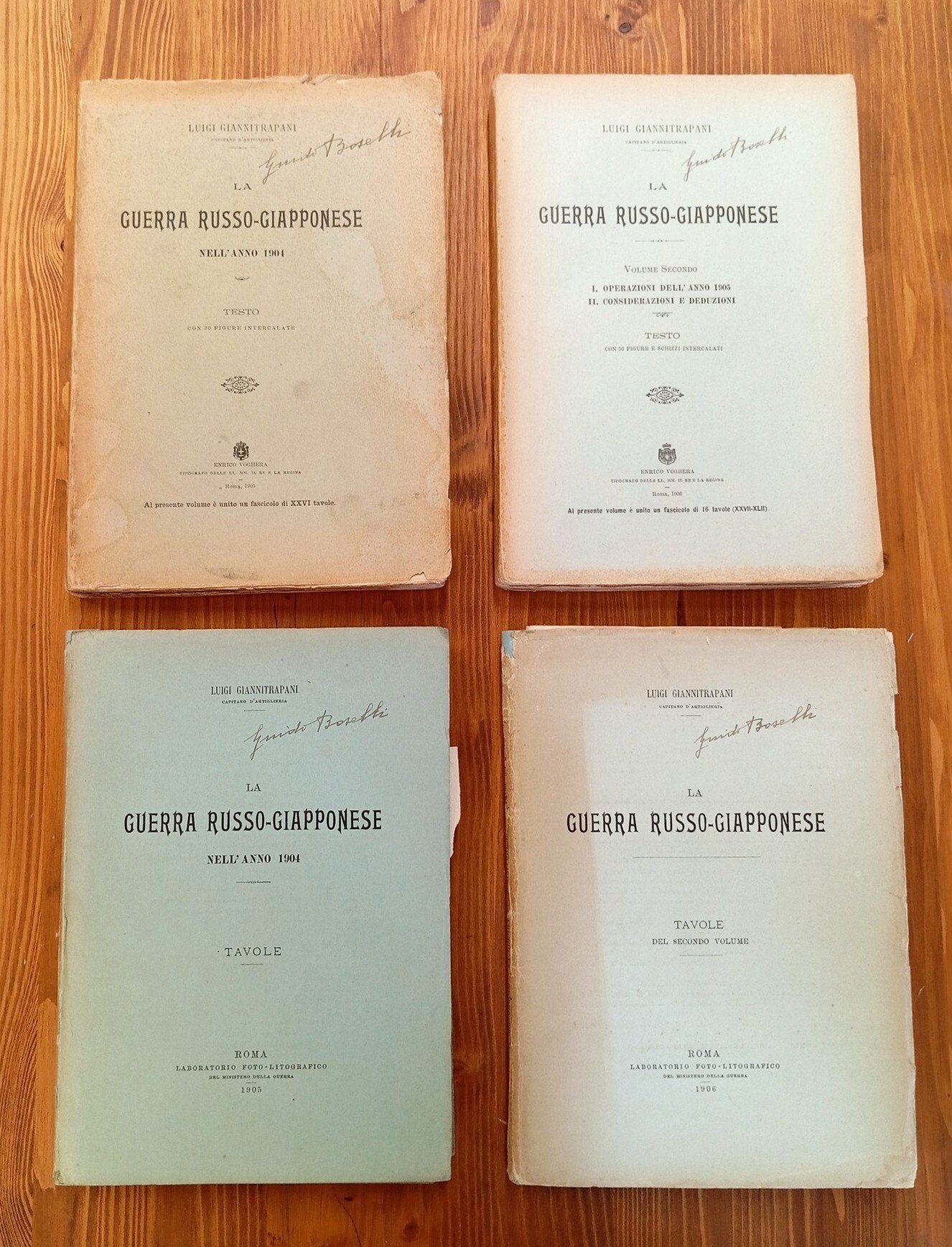 Opera completa costituita di due volumi in brossura e delle loro rispettive cartelle contenenti tavole illustrate. Vol. I: La guerra russo-giapponese nell'anno 1904 (viii-367 pp. con 30 figure intercalate) - Vol. II: parte I. Operazioni dell'anno 1905; parte II. Considerazioni e deduzioni (321 pp. con 56 figure e schizzi intercalati). I fascicoli a parte contengono rispettivamente XXVI e XVI carte ripiegate. I piatti anteriori recano tutti la firma di possesso del Maggiore d'Artiglieria Guido Boselli. Piccoli restauri conservativi e mende ai dorsi delle cartelle; bruniture e segni del tempo alle copertine; paginazione fresca e godibile; nel complesso opera ben conservata, oltre che completa; assai difficile reperibilità.