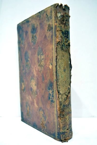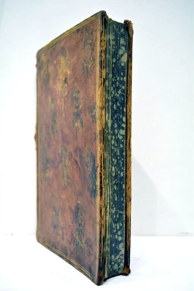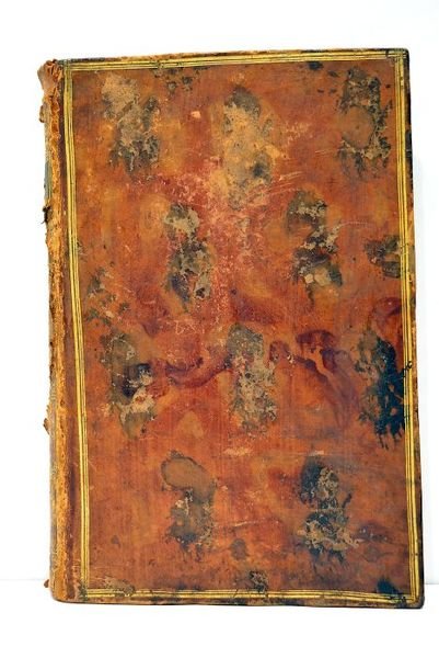 in-8. Portrait. XXIV. 261 pages. (21x14cm). Plein veau marbré. Filets dorés sur les plats. Tranches marbrées. Papier vergé bleuté. Grand manque au dos. Accidents aux coiffes. Frottements et petits manques. Quelques rares taches et mouillures claires à l'intérieur. Une petite tache d'encre sur 2 pages, à la fin, sans atteinte. Sinon reliure solide et excellent état intérieur. Charmant exemplaire sur papier vergé bleuté. Magnifique frontispice dessiné par A. Pujos avec portrait de Voltaire en medaillon. Ex-libris manuscrit : "Joannes Carolus Ledesma. Bibliothèque de St Eli[a] 1784". Très bon état intérieur.