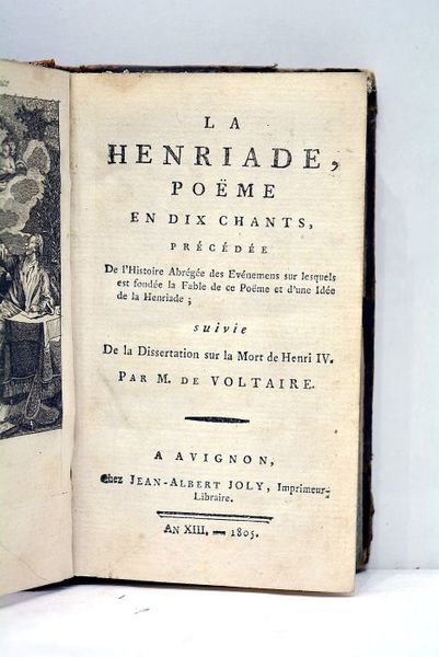 in-12. Frontispice. XVI. 163 pages. (13,5x8,5cm). Plein veau ancien. Dos lisse orné. Tranches jaspées. Manque la pièce de titre. Reliure très frottée avec épidermures et manques. Coins émoussés. Dos partiellement détaché. Quelques salissures et petites marques marginales de mouillure sans gravité. Bon état intérieur. Voltaire a écrit la Henriade en l’honneur du roi de France Henri IV et de la tolérance. Le sujet est le siège de Paris, commencé par Henri III de France et son beau-frère et successeur Henri III de Navarre, futur Henri IV. Les notices décrivent le rapport de ce texte avec les événements de l'époque. Rare impression avignonnaise. Petit format. Joli frontispice. Bon état intérieur.