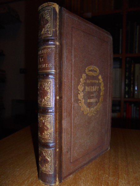 Par Voltaire. Paris, Librairie de Firmin Didot Frères, Fils et Cie., 1864. La Henriade. Poeme en dix Chants. De l' essai sur les guerres sur les Poetes du poeme de Fontenoy, des discours sur l' homme des poemes sur la loi naturelle et sur le désastre de Lisbonne du temple du gout et du temple l' amitié. In - 16°, m. pelle coeva con titolo e fregi in oro al dorso. 377, (1) pp. con ritratto dell' autore in antiporta inciso da Teopwood coperto da velina. Esemplare ben conservato. Neg. mob. 11