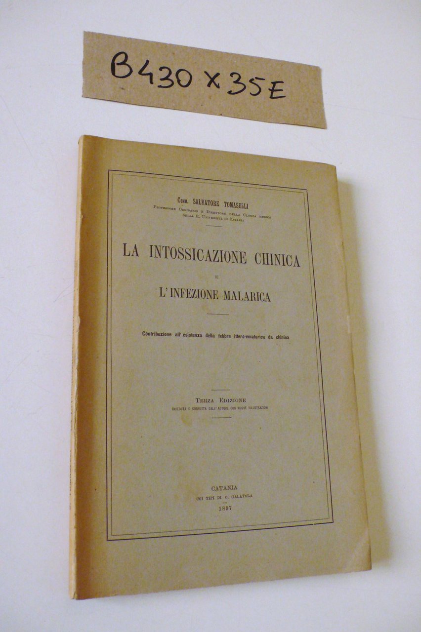 L'A. (Nicolosi 1832 - Catania 1907) fu Professore Ordinario e Direttore della Clinica medica della R. Università di Catania e varie volte Rettore della stessa Università - Terza edizione riveduta e corretta dall'Autore, con nuove illustrazioni. L'opera costituisce lo studio di maggior rilievo del Tomaselli, tanto che l'intossicazione malarica venne definita - sindrome di Tomaselli - . All'Autore fu Accademico, varie volte rettore dell'Università di Catania, risulta intestata un'importante via del capolugo etneo - DETTAGLIO DELLE CONDIZIONI : Esemplare quasi interamente intonso ed allo stato di nuovo fatta eccezione per il dorso leggermente inscurito - (35e).