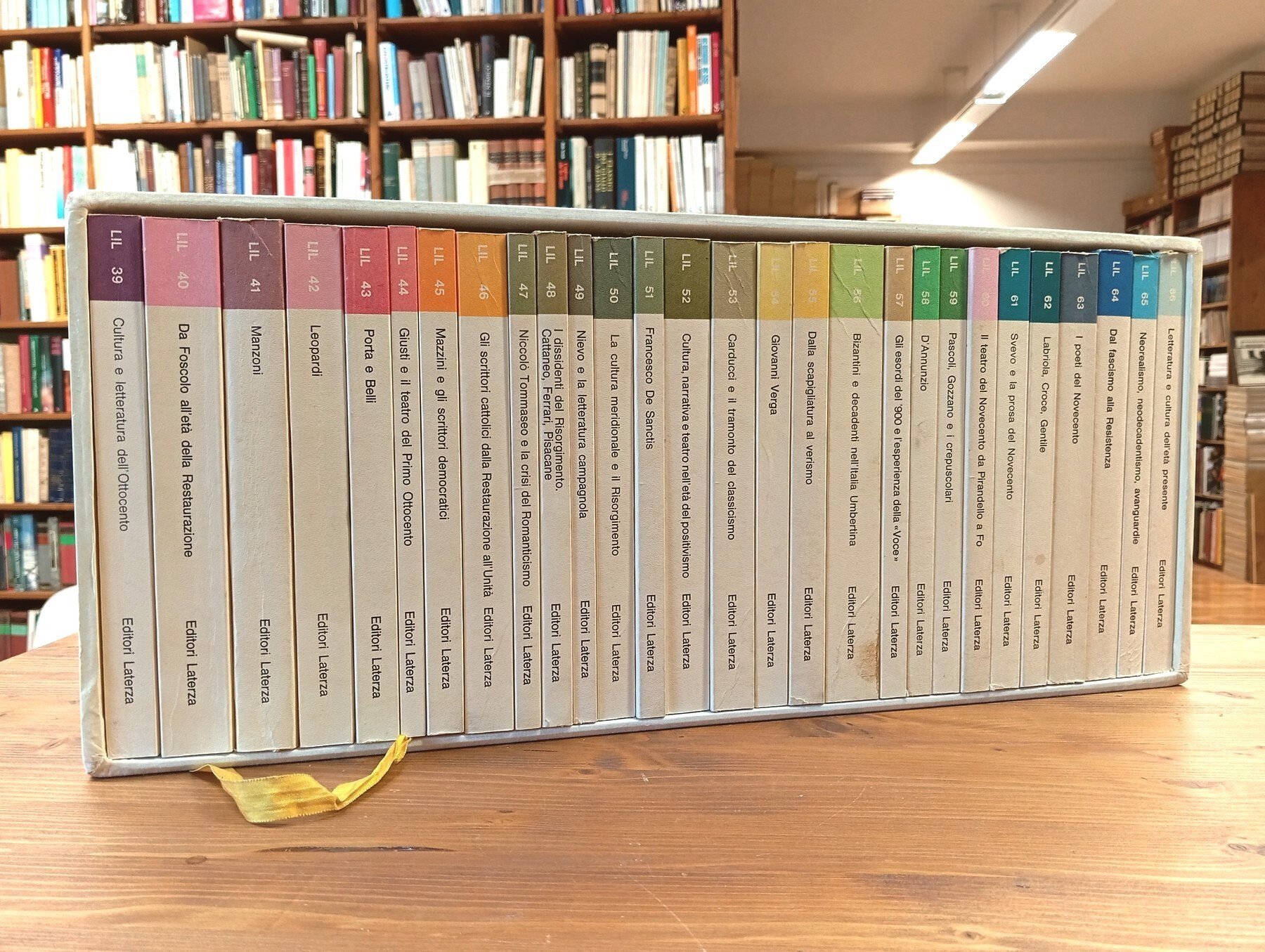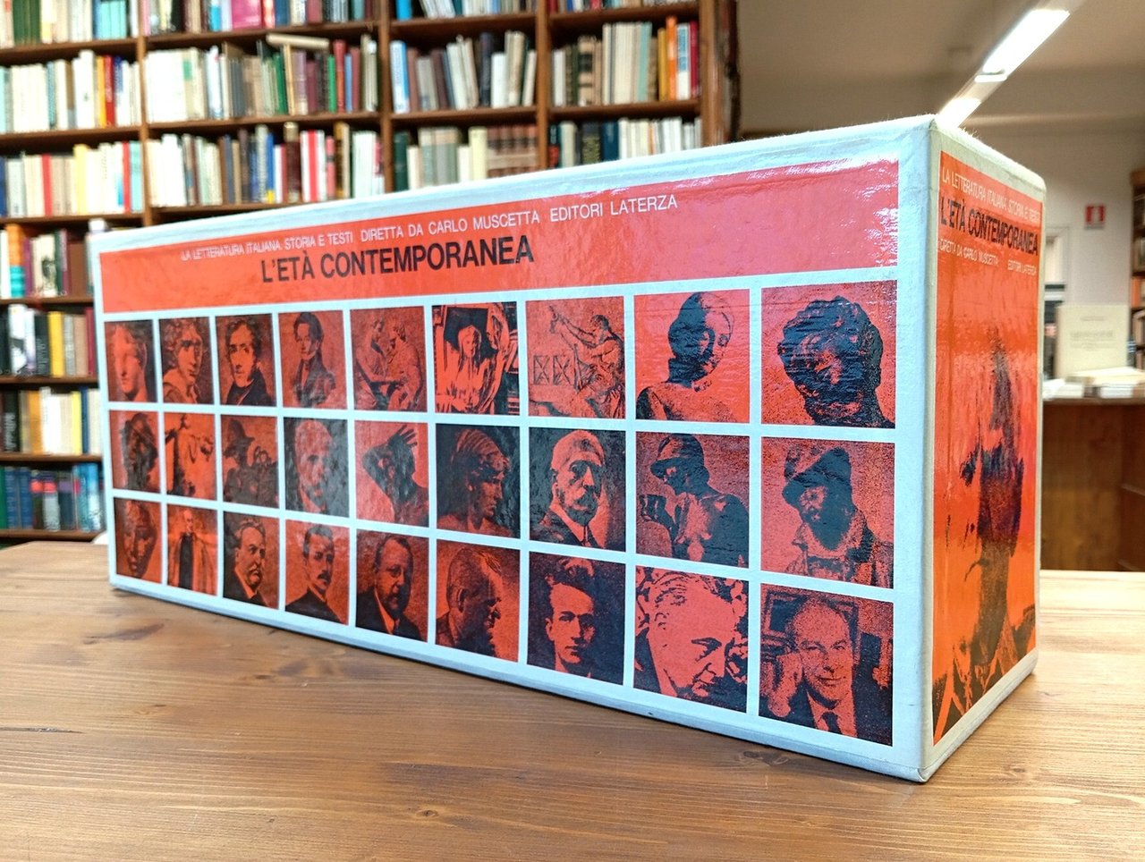 Ristampa 1978-80 - Serie completa dei volumi dell'opera dedicati all'età contemporanea, numerati da 39 a 66 - Ventotto (28) volumi in brossura editoriale, cofanetto in tela figurato su tre lati. Tenue brunitura ai dorsi, peraltro opera in eccellente stato, probabilmente mai consultata -- Dettaglio dei volumi: Vol. 39: "Cultura e letteratura dell'Ottocento" di Nicolò Mineo, pp. 179. Vol. 40: "Da Foscolo all'età della Restaurazione" di Nicolò Mineo e Attilio Marinari, pp. 261. Vol. 41: "Manzoni" di Salvatore S. Nigro, pp. 217. Vol. 42: "Leopardi" di Achille Tartaro, pp. 203. Vol. 43: "Porta e Belli" di Maria Teresa Lanza, pp. 159. Vol. 44: "Giusti e il teatro del Primo Ottocento" di Nicolò Mineo e Guido Nicastro, pp. 91. Vol. 45: "Mazzini e gli scrittori democratici" di Giovanni Pirodda, pp. 137. Vol. 46: "Gli scrittori cattolici dalla Restaurazione all'Unità" di Vito Lo Curto e Mario Themelly, pp. 189. Vol. 47: "Niccolò Tommaseo e la crisi del Romanticismo" di Luisa Gallotti Giordani e Rosa Maria Monastra, pp. 95. Vol. 48: "I dissidenti del Risorgimento. Cattaneo, Ferrari, Pisacane" di Ugo Dotti, pp. 113. Vol. 49: "Nievo e la letteratura campagnola" di Arnaldo Di Benedetto, pp. 91. Vol. 50: "La cultura meridionale e il Risorgimento" di Attilio Marinari e Giovanni Pirodda, pp. 165. Vol. 51: "Francesco De Sanctis" di Carlo Muscetta, pp. 113. Vol. 52: "Cultura, narrativa e teatro nell'età del positivismo" di Franca Angelini e Carlo A. Madrignani, pp. 201. Vol. 53: "Carducci e il tramonto del classicismo" di Rosario Contarino e Rosa Maria Monastra, pp. 193. Vol. 54: "Giovanni Verga" di Romano Luperini, pp. 143. Vol. 55: "Dalla Scapigliatura al Verismo" di Lina Bolzoni e Marcella Tedeschi, pp. 163. Vol. 56: "Bizantini e decadenti nell'Italia umbertina" di Elsa Sormani, pp. 267. Vol. 57: "Gli esordi del Novecento e l'esperienza della Voce" di Romano Luperini, pp. 123. Vol. 58: "D'Annunzio" di Emanuella Scarano Lugnani, pp. 113. Vol. 59: "Pascoli, Gozzano e i crepuscolari" di Giuseppe Savoca e Mario Tropea, pp. 131. Vol. 60: "Il teatro del Novecento da Pirandello a Fo" di Franca Angelini, pp. 157. Vol. 61: "Svevo e la prosa del Novecento" di Sandro Maxia, pp. 151. Vol. 62: "Labriola, Croce, Gentile" di Nicola Badaloni e Carlo Muscetta, pp. 141. Vol. 63: "I poeti del Novecento" di Franco Fortini, pp. 227. Vol. 64: "Dal fascismo alla Resistenza" di Rosario Contarino e Marcella Tedeschi , pp. 217. Vol. 65: "Neorealismo, neodecadentismo, avanguardie" di Romano Luperini e Eduardo Melfi, pp. 159. Vol. 66: "Letteratura e cultura dell'età presente" di Vanna Gazzola Stacchini e Romano Luperini, pp. 203.