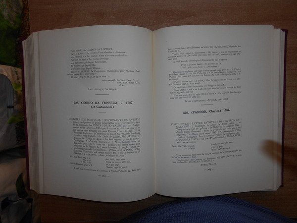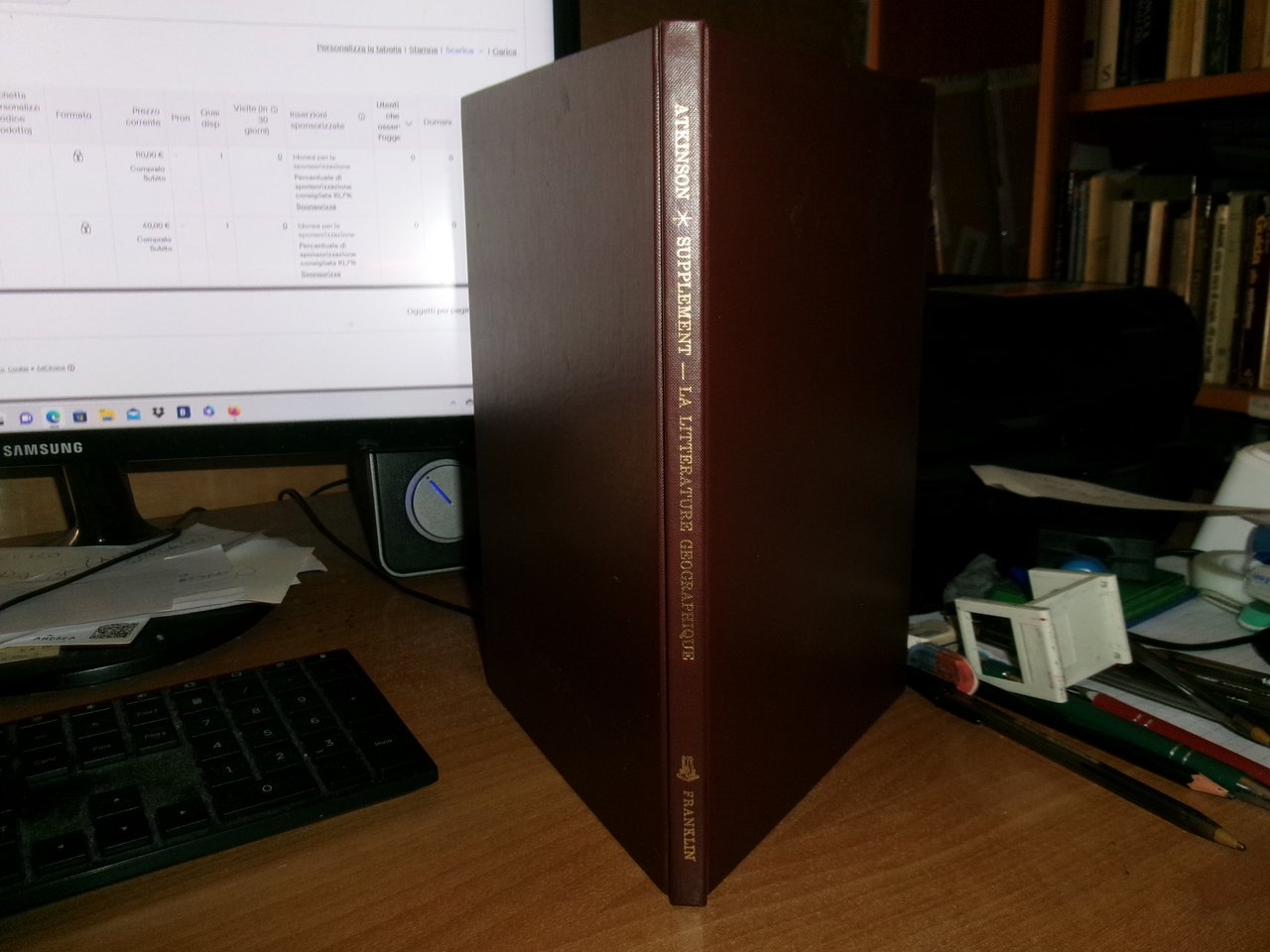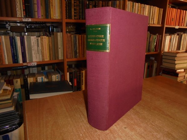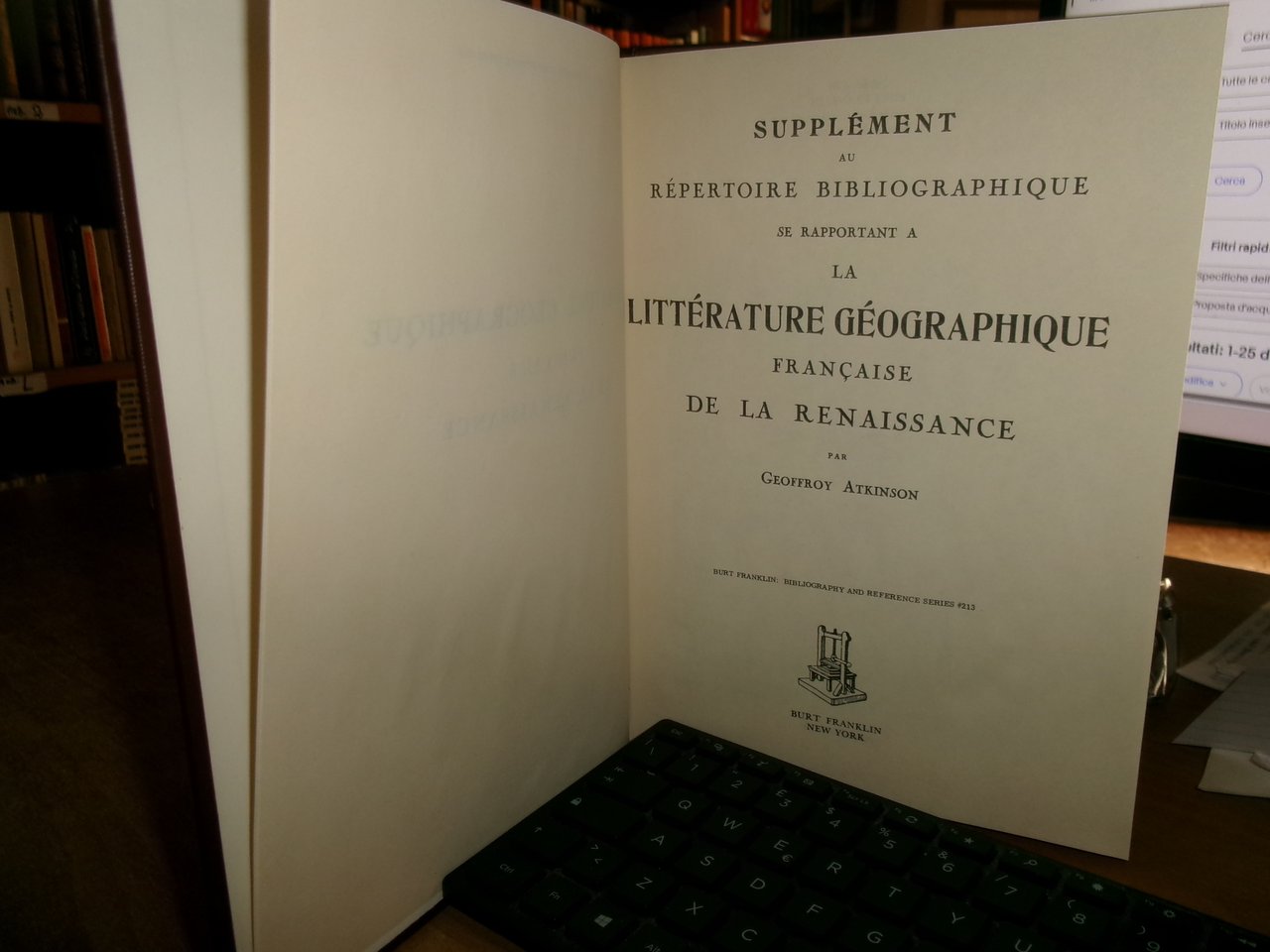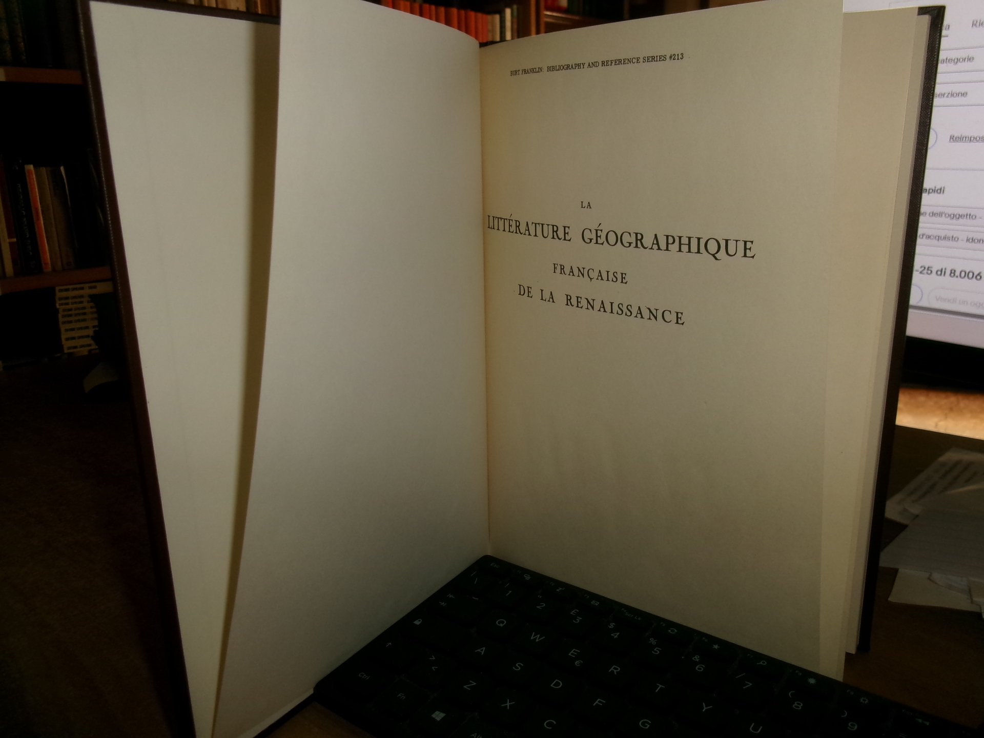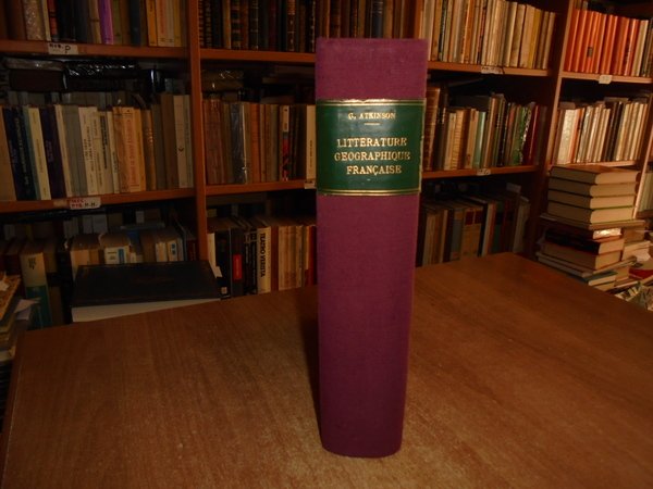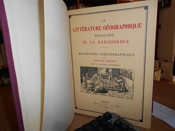 GEOFFROY ATKINSON. Paris, Editions Auguste Picard, Rue Bonaparte, 82, 1927. La Littérature Géographique Française de la Renaissance. Répertoire Bibliographique. Description de 524 impressions d' uovrages publiés en français avant 1610 et traitant des pays et des peuples non européens, que l'on trouve dans les principales Bibliothèques de France et de l' Europe occidentale. 2 volumi in-4°, tela bordeaux con titolo iin oro entro tassello al dorso, brossure originali conservate. 563, (2) pp. con 293 figure in nero n.t. Supplemént au Répertoire Bibliographique Française... reprinted 1968. 88 pp. con una tavola n.t. Bell' esemplare numerato (n° 389) tirato in 550 copie. Edizione originale. Uff. B - II - 7 - 2