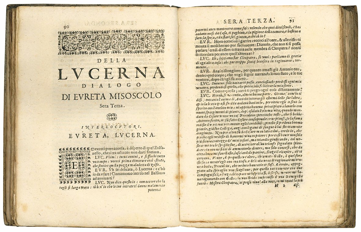 The work is divided into four evenings in which the autobiographical character Eureta, a student at the University of Padua, listens to the tales of his oil lamp, which contains a soul that has reincarnated several times. The oil lamp tells stories from all times and places, and this is a pretext for the author to mix different genres and to imitate and quote different authors. In the work we move from stories of reincarnation in animals, men and women, to an Aristotelian philosopher, to a courtesan, to Cleopatra, etc. Other exotic or erotic or horrific stories are based on the fact that the “lucerna” is being sold and passes from one house to another. The text is thus a large collection of varied narrative material and combines different literary genres and forms.
