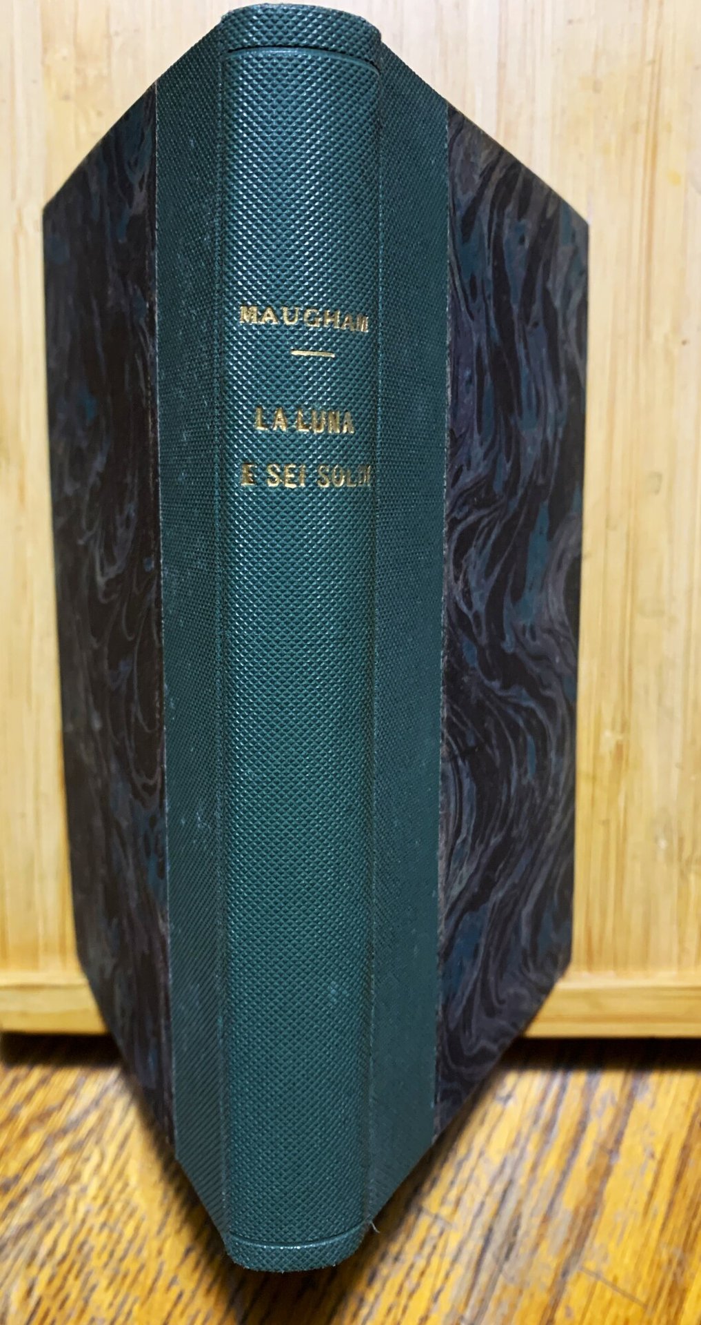II ed. italiana: 1943 (I ed. italiana: Milano, Bietti 1933 I ed.: The Moon and Sixpence, London, William Heinemann, 1919 e New York George H. Doran 1919). Traduzione M. Parisi. Con Prefazione de Gli Editori. XVI/ 288/ rilegatura in mezza tela verde con titoli dorati al dorso e con piatti rifiniti in carta marmorizzata nei toni del nero, del verde e del rosa. Sguardie marmorizzate nei toni del nero e del verde (conservato il primo piatto della copertina, in cartoncino liscio con grafica in azzurro/b/n e con piccola illustrazione in b/n al primo piatto: una donna tahitiana). In antiporta tavola patinata con "Autoritratto di Paul Gauguin", in b/n. Biografia di Paul Gauguin. Stato buono (pagine leggermente brunite - dedica ad inchiostro nero in frontespizio e appunto a matita al colophon).