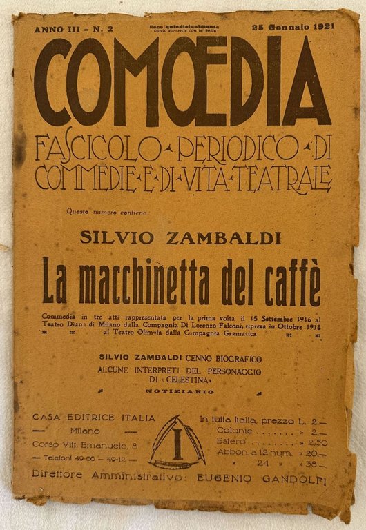 Edizione del 25 gennaio 1921 delle commedia teatrale "La macchinetta del caffe" di Silvio Zambaldi (1870-1932) della collana "Fascicolo periodico di commedie straniere di grande successo". Foto di Zambaldi. In buone condizioni. Copertina editoriale in buone condizioni generali con lievi usure ai margini e dorso. Legatura in buone condizioni. All'interno le pagine si presentano in buone condizioni con rare fioriture. In 8. Dim. 24,5x17 cm. Pp. 48.Edition of 25th of january 1921 of the theatre play "La macchinetta del caffe" by Silvio Zambaldi (1870-1932) of the series "Repertorio fascicolo periodico di commedie straniere di grande successo". Photo of Zambaldi. In good conditions. Editorial cover in good general conditions lgihtly worn in the extremities. Binding in good conditions. Inside pages are in good conditions with occasional foxing. In 8. Dim. 24,5x17 cm. Pp. 48.