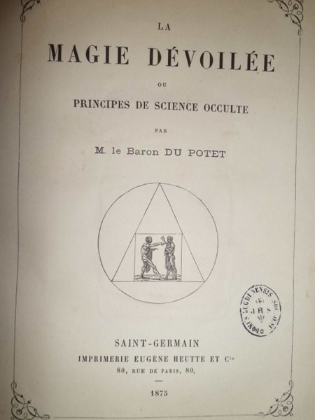 DUPOTET, Jules Denis (1790 - 1881). La magie dévoileé ou Principes de science occulte. Saint - Germain, Eugène Heutte, 1875. In - 4°, m.pelle nera con nervi, piani in tela con riquadro in oro. viii, 284 pp. con alcune illustrazioni n.t. e 3 tavole f.t. contenenti 12 figure incise in legno inerenti alla magia. Rara seconda edizione aumentata e corretta, tirata a poche copie fuori commercio riservate agli iniziati. Ottimo esemplare con una vera fotografia dell' autore applicata al verso del frontespizio e un suo necrologio aggiunto in fine. Opera importantissima ed introvabile. << Cet ouvrage n'a pas été mis dans la cemmerce. Le baron Du Potet le reservait a ses initiés auquels il le cédait au prix de 100 francs l' esemplaire, et moyennant le serment par écrit de ne la communiquer à personne et de ne point révéler des secrets qui s'y truvent indiqués >> (Stanislas de Guaita, 1332). Cailet, 3405. Dorbon, 1387: << Edition très rare. >> Coumont, D113.2. Neg. mob. nuovo comput.