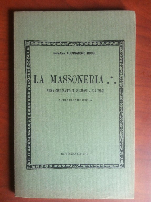 LA MASSONERIAPoema Comi-Tragico di 33 straofe - 333 versia cura di Carlo OssolaSenatore Alessandri RossiNeri Pozzi Editore 1986Edizione anastatica in 333 esemplari numerati n^ 10843 pagine - formato 13,5x21 cmin ottimo stato intonso (gr. 145)E12933