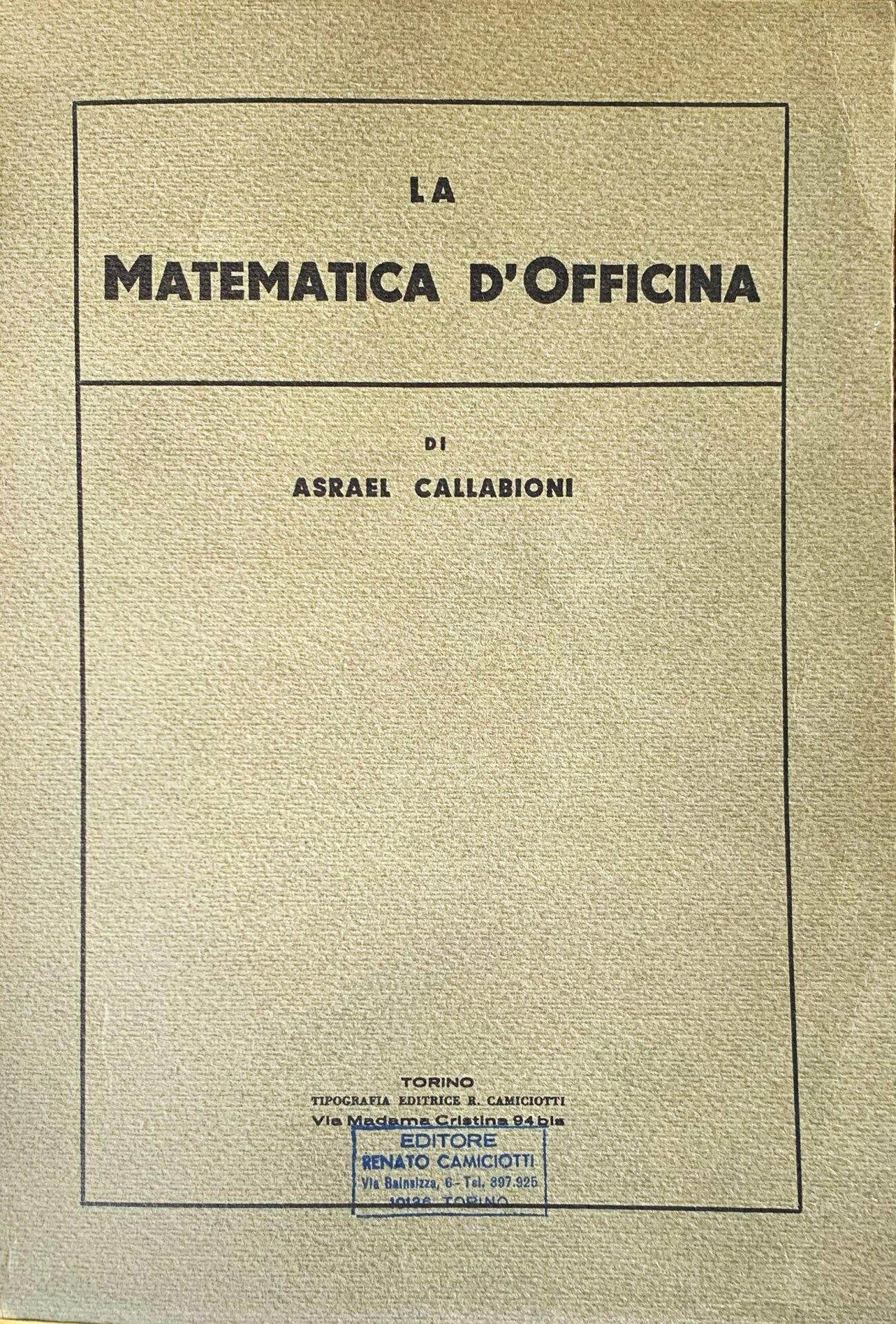 X ed. s.d. (>= 1925). VIII/ (8)+384/ brossura in cartoncino ruvido grigio con titoli in nero. Con tabelle in nero. Stato buono (pagine leggermente brunite). Indice: Prefazione; Asrael Callabioni (Torino, settembre 1925) - Dei segni e delle quattro operazioni - Espressioni con parentesi - Potenze e radici - Tabelle dei quadrati e cubi dei numeri interi successivi - Tabelle delle radici quadrate e cubiche dei numeri interi successivi dall'1 al 2100 - Numeri primi - Frazioni-Definizioni e proprietà generali - Misure - I numeri relativi - Rapporti e proporzioni - Le formule e la loro applicazione - Delle equazioni - Superficie di figure piane e volume dei solidi - Circonferenze e superficie dei circoli - Proposizioni geometriche - Velocità delle pulegge e degli ingranaggi - Della conicità ed inclinazione - Della velocità di taglio e durata di una operazione - Trigonometria rettilinea - Calcolo delle ruote di ricambio per filettare - Costruzione della testa a dividdere - Calcolo delle ruote di ricambio per fresature elicoidali - La testa a dividere-Calcoli - Le frazioni continue e la loro applicazione - Tabelle degli equivalenti in decimali delle frazioni da 1/100 a 99/100 - Logaritmi.
