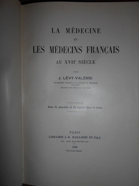 J. Lévy-Valensi. Paris, Librairie J.-B. Baillière et Fils, 1933. La Médecine et Les Médecins Français au XVII Siècle. In-8°, tela verde con titolo in oro entro tassello al dorso, copertine originali conservate. (3), 668 pp. con 54 tavole e 86 figure nel testo. Esemplare come nuovo. Uff. C - IV - 3