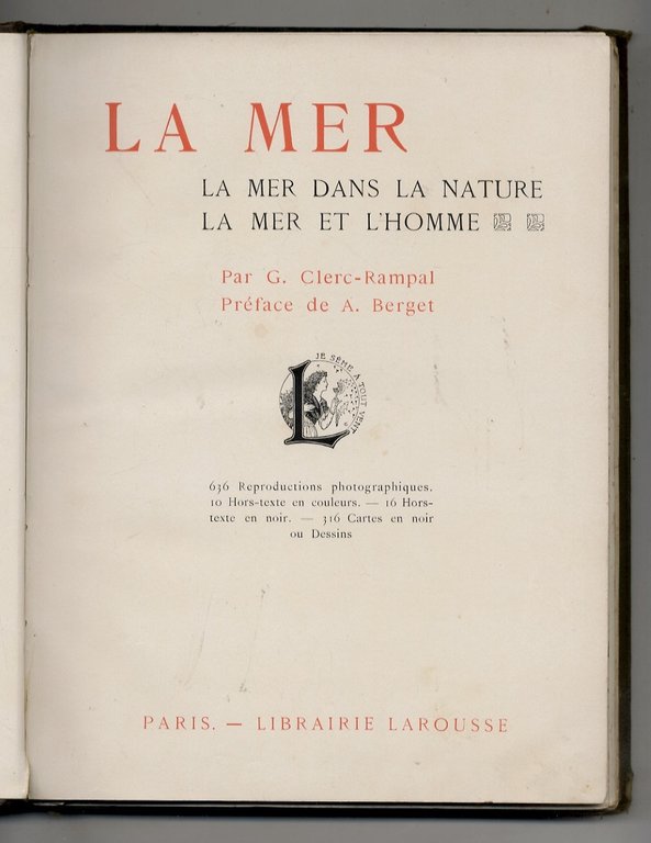 La mer. La mer dans la nature. La mer et l'homme [.] Préface de A. Berget. 636 reproductions photographiques. 10 hors-texte en couleurs. 16 hors-texre en noir - 316 cartes en noir ou dessins.