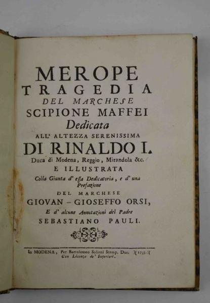 La Merope. Colla Giunta d'essa Dedicatoria, e d'una Prefazione del Marchese Giovan-Gioseffo Orsi, e d'alcune Annotazioni del Padre Sebastiano Paoli.