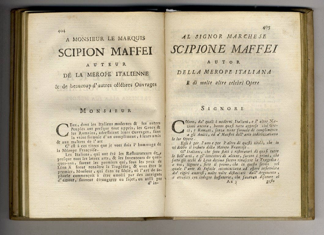 Livorno, per Antonio Santini e compagni, 1763, in-8, legatura coeva in piena pergamena, pp. CV, [5], 7-476, [4], le ultime due carte bianche. A carta Aa2r inizia, con testo originale a fronte: Lettera del sig. di Voltaire premessa alla sua Merope stampata pochi mesi sono in Parigi. Buon esemplare.