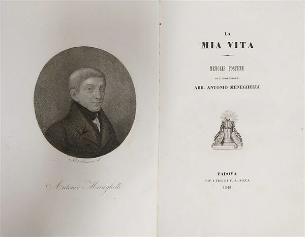 in-8, pp. 79, bella leg. cart. color. coevo. Ritr. dell’A. inc. in rame da N. Schiavon in antip. Al fine ricca bibliografia delle opere del Meneghelli pubblicate dal 1802 al 1844. Ottima autobiografia dello scrittore nato a Verona nel 1765. Belliss. esempl. su carta pesante. [143]