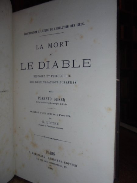 (Esoterismo) GENER, Pompeyo. Paris, C. Reinwald,1880. La mort et le Diable. Histoire et philosophie de deux négations suprèmes. Précédé di une lettre à l' Auteur de E. Littré. In-8°, tela edit. con titoli in oro al dorso. XL, 780 pp. Bell'esemplare a fogli chiusi. Edizione originale ed unica. Caillet, 4455: << Savant ouvrage prodigeusement documenté et d'un puissant intérêt. >>. Dorbon, 5881. Guaita, 1410. Coumont, p. 219, G24.1. Uff. stanzetta.