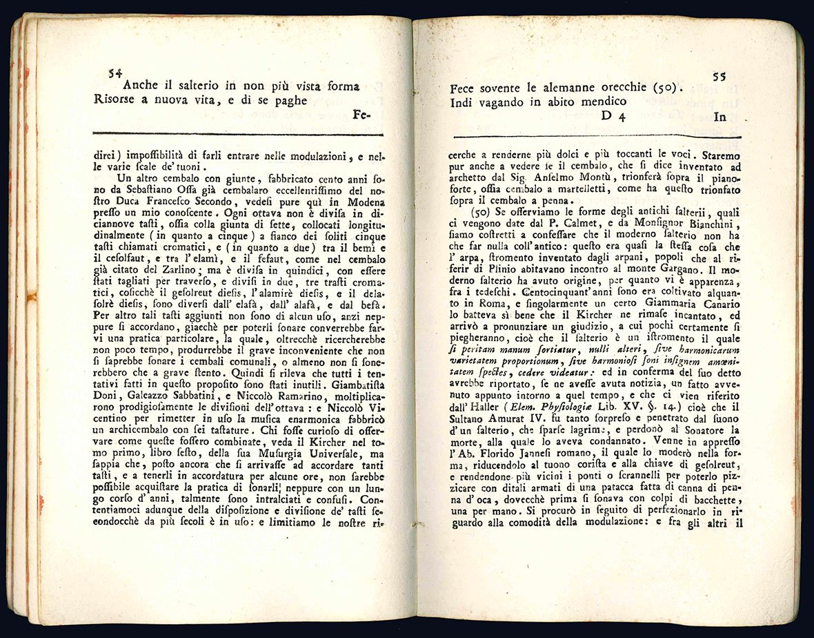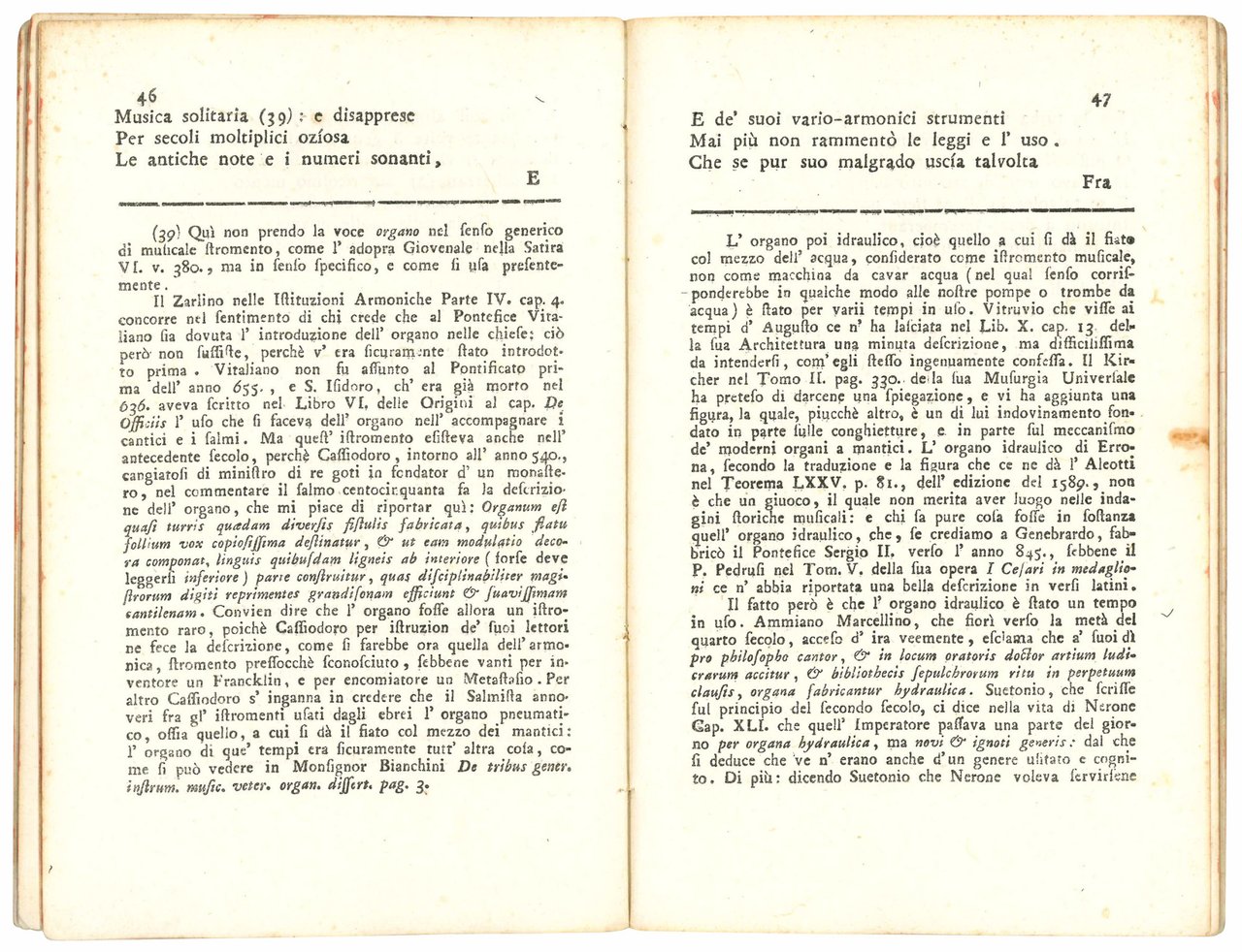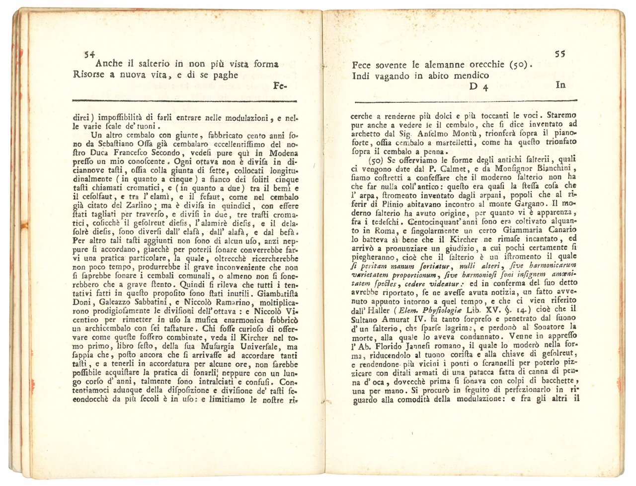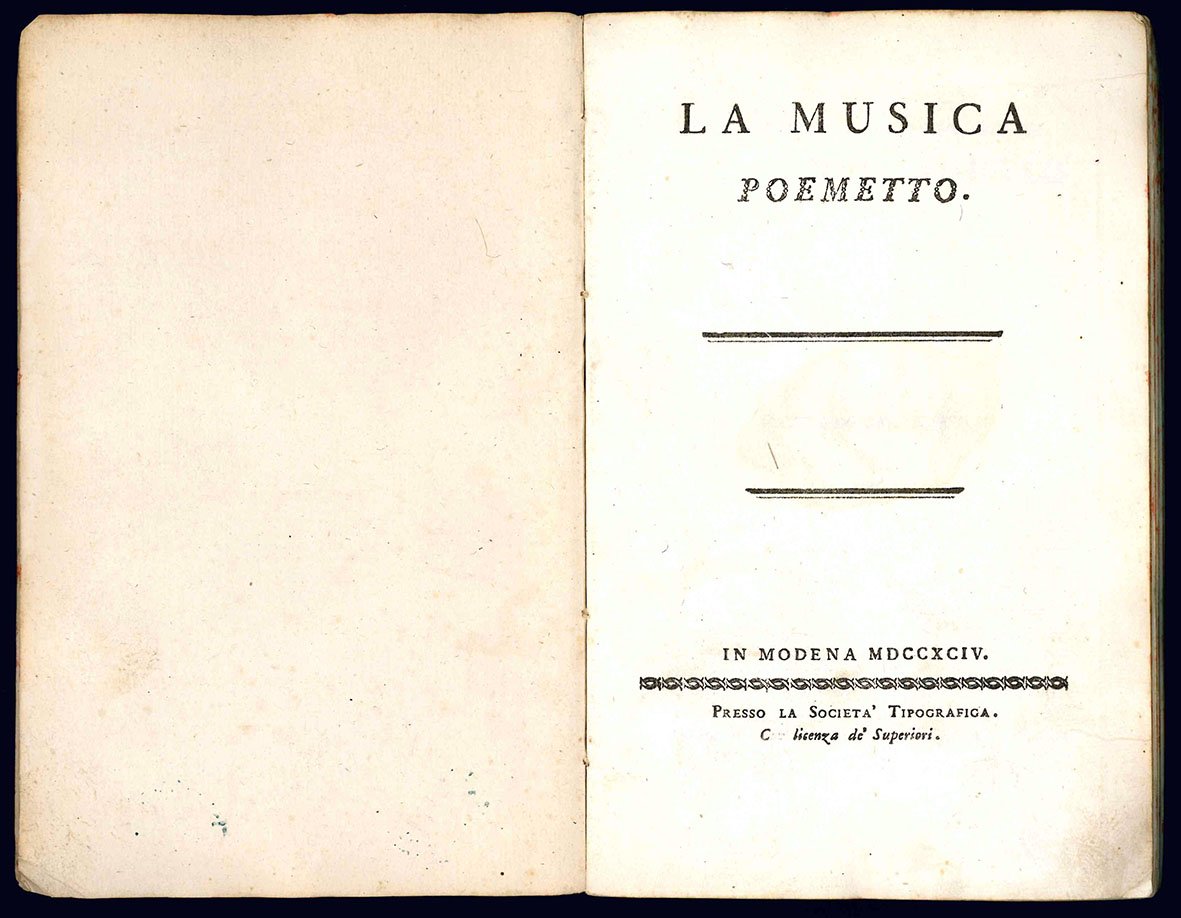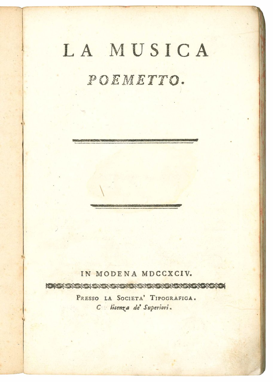 Prima edizione, dedicata dal Dall'Olio a Giovanni Paisiello (Modena, 1 ottobre 1794), di questo poemetto sulla musica accompagnato dalle interessantissime note dell'autore. Queste contengono dettagliate informazioni sulla storia della musica, sul melodramma, sull'invenzione di alcuni strumenti musicali e sulle opere di numerosi musicisti, in gran parte meno noti, con frequenti riferimenti a specifici strumenti e manoscritti visionati personalmente dall'autore."Il poemetto è una cosa da nulla, ma le note ond'è corredato sono un gioiello d'erudizione" (G. Gaspari, Catalogo della Biblioteca musicale G.B. Martini di Bologna, Ivi, 1961, I, p. 101).Di notevole interesse sono le note sugli strumenti musicali, la loro storia e la loro struttura. Ci riferiamo in particolare alla nota 39 sugli organi; alla nota 48 dove si parla del fagotto, cominciando dall'opera di Teseo A. degli Albonesi (1539) e attribuendone il milgioramento tecnico (due linguette, una d'argento ed una di bronzo) ad Afranio famigliare del card. Ippolito d'Este; e alla nota 49 sul pianoforte, dove si legge una dissertazione sull'ampiezza delle ottave da Zarlino in poi.G.B. Dall'Olio nacque a Sesso, vicino Reggio Emilia, nel 1739. Si formò a Bologna, dove tra l'altro apprese la musica dal padre G.B. Martini. Nel 1764 fu nominato maestro delle pubbliche scuole di Rubiera e organista della Collegiata. Successivamente rivestì varie altre cariche, tra cui quella di cancelliere delle Opere Pie. Nel 1784 si trasferì a Modena in qualità di ragioniere ducale. In corrispondenza con illustri scienziati, letterati e musicisti del tempo, come Paisiello, Ximenes, Lampredi, Paradisi, Venturi, Ceretti, Corti e Tiraboschi (con il quale collaborò alla stesura di alcune voci della Biblioteca Modenese), solo per nominarne alcuni, scrisse saggi di matematica, cinque commedie (in parte rappresentate nei teatri di Modena e Parma), delle novelle e delle poesie; si occupò inoltre di archeologia, storia locale e scienze naturali. Fece parte dell'Accademia ducale dei Dissonanti di Modena, dell'Accademia degli Ipocondriaci di Reggio, di quella dei Teopneusti di Correggio, di quelle dei Quirini e degli Aborigeni di Roma e di quella dei Georgofili di Firenze. Fu inoltre membro della Società Agraria, della Società Italiana e dell'Accademia di Scienze, Lettere ed Arti di Modena. Nel 1815 fu incaricato di ordinare e catalogare la collezione di opere musicali della Biblioteca Estense. Morì nel maggio del 1823 (cfr. C.M., Di Giambattista dall'Olio reggiano notizie biografiche e letterarie con appendici, in: L. Cerretti, "Notizie biografiche e letterarie in continuazione alla Biblioteca modenese", Reggio Emilia, 1833, pp. 1-28).