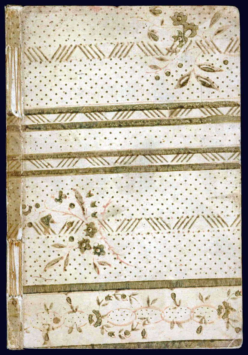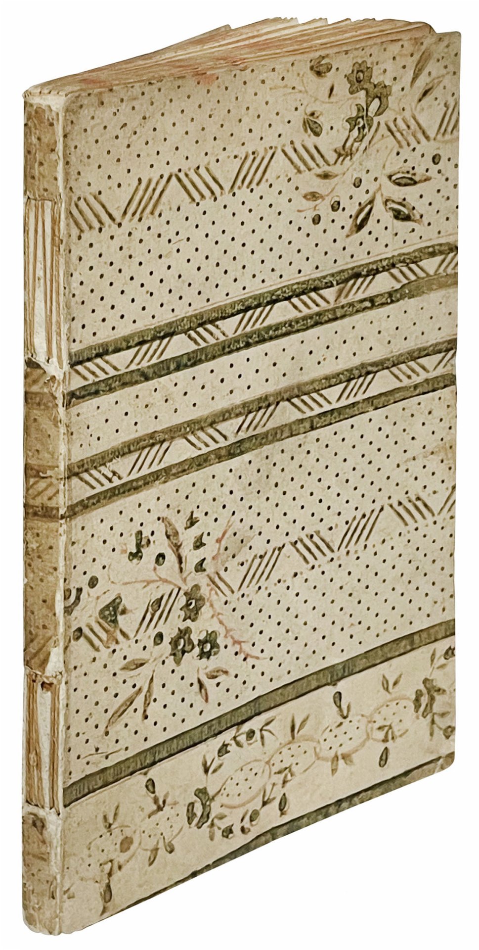 In 8vo (mm. 213x135). Pp. 78, [2]. Legatura coeva in cartoncino cucito alla rustica e ricoperto di bella carta colorata, taglio marmorizzato. Piccola abrasione sul titolo senza danno al testo, per il resto ottima copia su carta greve.