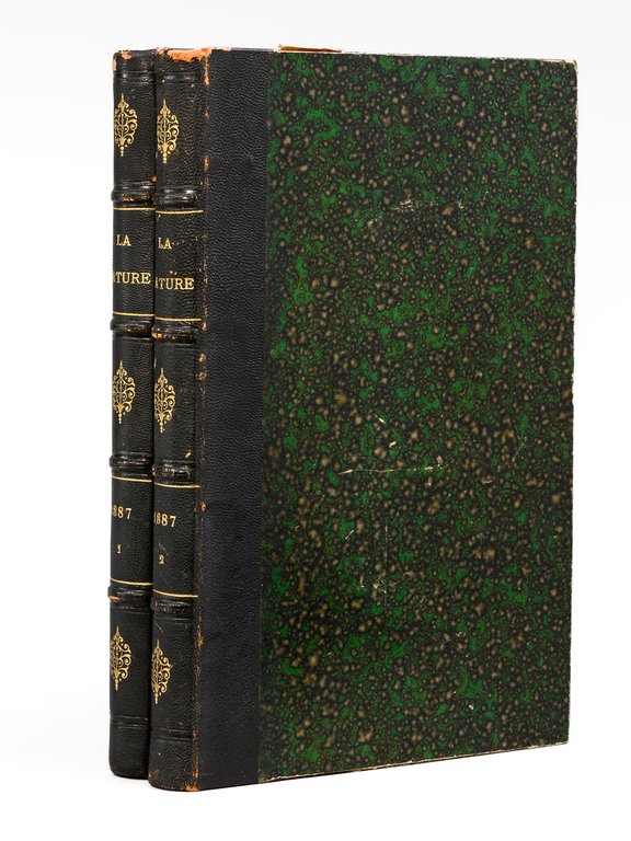 2 vol. in-4 rel. demi-chagrin vert, dos à 4 nerfs, G. Masson éditeur, Paris, 1887, 427 pp. et 427 pp. Au Sommaire notamment : Les locomotives. Progrès récents réalisés par M. Ricour ; Les diamants de la Couronne ; L'âge des métaux au Mexique ; Le laboratoire de zoologie de la société scientifique d'Arcachon ; L'origine des Vertébrés et le troisième oeil des Reptiles ; Pêches et pêcheries de l'Annam. La pêche au dauphin ; Le calendrier perpétuel et la mnémonique ; Les entrepôts frigorifiques à refroidissement artificiel ; L'habitation au Tonkin sous le rapport de l'hygiène ; Aiguille d'enfoncement à poids variable pour l'essai des chaux et ciments ; L'if, ses propriétés toxiques ; L'autographomètre ; La science au théâtre. Sur un appareil permettant de transmettre la mesure à des exécutants placés de manière à ne point voir le chef d'orchestre ; L'eau potable et la fièvre typhoïde ; Les cénotés du Yucatan ; La chaîne des Alpes photographiée à 103 kilomètres de distance ; Association de l'homme et des animaux sauvages pour la pêche et la chasse ; Bec à incandescence du Dr Auer von Welsbach ; Chute d'un pont de chemin de fer aux États-Unis ; Le Mont Blanc vu de l'observatoire du Puy-de-Dôme ; La tombe Maori au Musée du Trocadéro ; Les grands flotteurs en eau courante ; L'éclairage électrique à l'Opéra de Paris ; Les faux rubis ; Le petit « Ursus spelaeus » de Gargas ; Les appareils de sauvetage en cas d'incendie ; Le liège ; La Morgue à Paris, et les nouveaux appareils frigorifiques ; Fabrication des timbres en caoutchouc ; Sondages et forages ; La nourriture de la sardine ; Les nains et les géants. Les variations de la stature humaine ; Les mains à six doigts ; Les perroquets acrobates