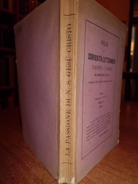 (Curiosità letterarie inedite o rare). La Passione del N.S. Gesù Cristo. Poema attribuito a Giovanni Boccacci, pubblicato per cura di Luigi Razzolini membro della R. Commissione pe' Testi di Lingua sopra un codice proprio del sec. XVI. Bologna, Gaetano Romagnoli, 1878. In - 16°, br., cop. orig. XXVI, 194, (2) pp. + (4) pp. con elenco dei volumi già pubblicati dall' editore. Edizione di soli 202 esemplari (es. n° 188). Ben conservato ed intonso. Uff. scat. 6