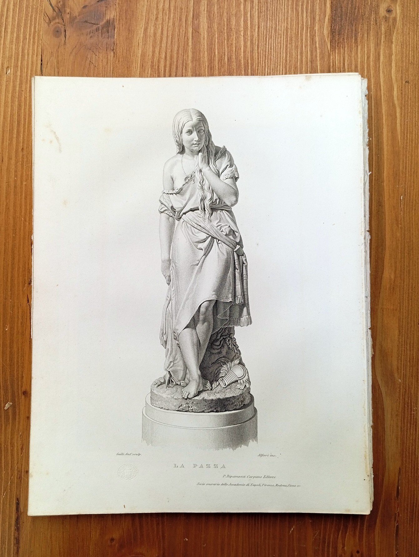 Incisione estratta dal volume "Gemme d'arti italiane - anno ottavo, 1855" (Milano, Venezia e Verona, coi tipi dello Stabilimento Nazionale di P. Ripamonti Carpano). Foglio di 20,5 x 27 cm circa; da una scultura di Antonio Galli, su disegno di Aurelio Alfieri incisore. Minime fioriture ai margini, nel complesso buon esemplare.