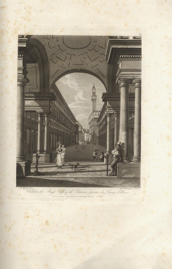 Firenze, presso Luigi Bardi, 1830, in-folio, br. editoriale con fregi tipografici (i dati editoriali in copertina anteriore differiscono da quelli del frontespizio, titolo in copertina: "La piazza del Granduca con i suoi monumenti. Dispensa. Pisa, presso Niccolò Capurro co' caratteri di F. Didot, 1829), pp. 28, [2]. Con frontespizio calcografico con piccola veduta di Firenze e 21 tavole incise in rame in fine: 3 all'acquatinta (incise, da Paolo Fumagalli) e 18 incise al tratto. Qualche leggera fioritura ma bell'esemplare, completo.