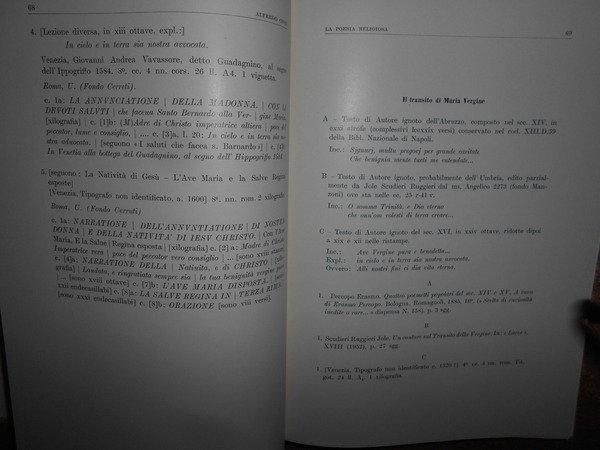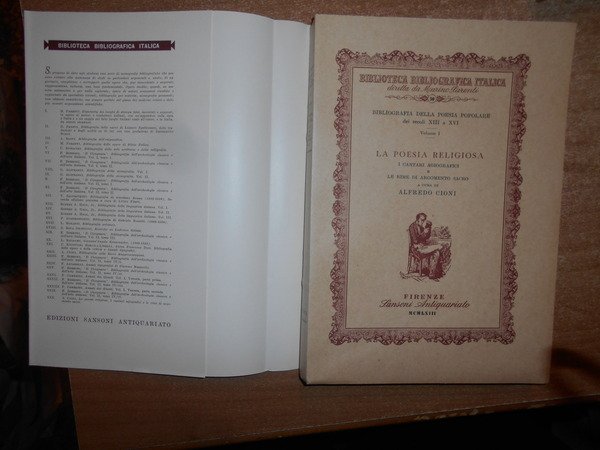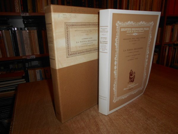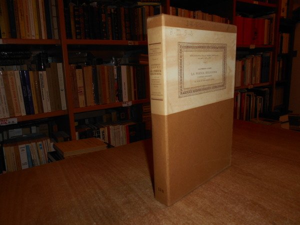 A cura di Alfredo Cioni. Firenze, Sansoni Antiquariato, 1963. LA POESIA RELIGIOSA. I CANTARI AGIOGRAFICI E LE RIME DI ARGOMENTO SACRO. In-8° grande, cart. edit. con sovracopertina. 316, (2) pp. Volume I della "Bibliografia della poesia popolare dei secoli XIII a XVI". Dall'Indice: Prefazione di Marino Parenti. Introduzione. Testi più comunemente citati. Poemetti e cantari cristologici. La Madonna. I Santi. Personaggi del Vecchio Testamento. I "Novissimi". Cantari ascetici leggendari. Contrasti. Indici. Opera inserita nella "Biblioteca bibliografica italica diretta da Marino Parenti". Illustrazioni in nero nel testo. Edizione in 666 esemplari numerati a macchina (nostro esemplare n° 108). Libro in ottimo stato di conservazione parzialmente intonso con astuccio. Uff. B - II - 5 - 2