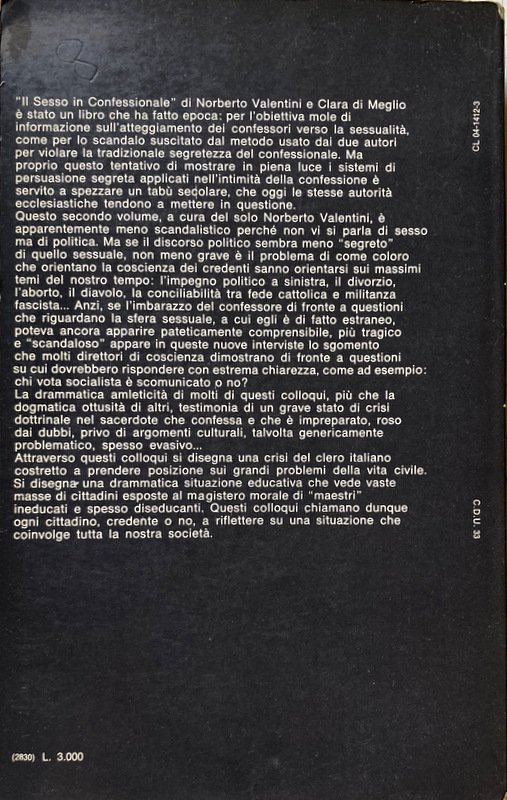 Questo secondo volume, a cura del solo Norberto Valentini, è apparentemente meno scandalistico perché non vi si parla di sesso ma di politica. Ma se il discorso politico sembra meno segreto di quello sessuale, non meno grave è il problema di come coloro che orientano la coscienza dei credenti sanno orientarsi sui massimi temi del nostro tempo: l'impegno politico a sinistra, il divorzio, l'aborto, il diavolo, la conciliabilità tra fede cattolica e militanza fascista. Anzi, se l'imbarazzo del confessore di fronte a questioni che riguardano la sfera sessuale, a cui egli è di fatto estraneo, poteva ancora apparire pateticamente comprensibile, più tragico e "scandaloso" appare in queste nuove interviste lo sgomento che molti direttori di coscienza dimostrano di fronte a questioni su cui dovrebbero rispondere con estrema chiarezza, come ad esempio: chi vota socialista è scomunicato o no? La drammatica amleticità di molti di questi colloqui, più che la dogmatica ottusità di altri, testimonia di un grave stato di crisi dottrinale nel sacerdote che confessa e che è impreparato, roso dai dubbi, privo di argomenti culturali, talvolta genericamente problematico, spesso evasivo.