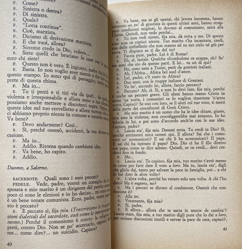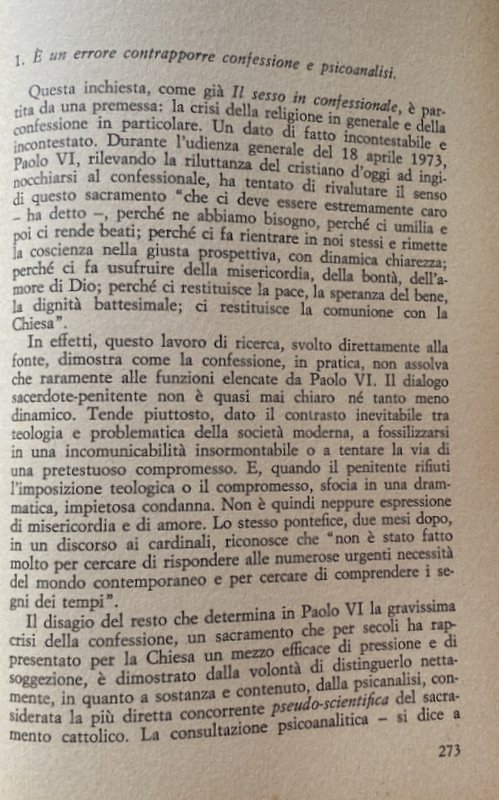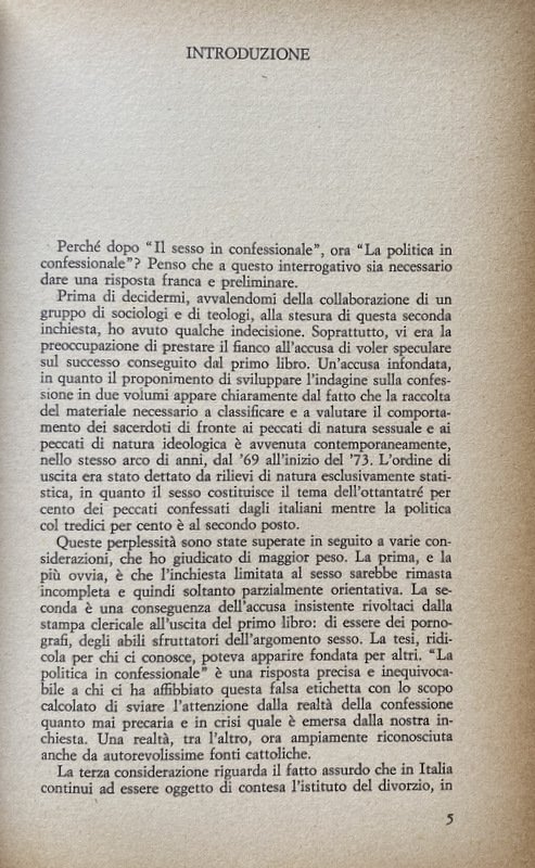Soggetti: Anni Sessanta, Anni Settanta, Fermento, Cattolicesimo, Concilio Vaticano II, Inchieste, Scandali, Registrazioni audio, Colloqui, Confessionale, Penitenti, Sacerdoti, Opinioni, Confessori, Etica, Politica, Attualità, Sesso in confessionale, Clara Di Meglio, 1966, Francia, Témoignage Chrétien, Giordano Bruno Guerri, Io ti assolvo, Sociologia, Teologia, Chiese, Educazione, Cultura cattolica, Società, Religione, Superstizione, Miti, Credenze, Peccato, Politici, Dossier, Chiesa, Vocazione, Messa, Confessione, Sacramenti, Potere, Autoritarismo, Capitalismo, Attivisti, Estrema sinistra, Estrema destra, Evasione fiscale, Speculazione, Raccomandazioni, Arrivismo, Ingiustizie sociali, Libertà di espressione, Referendum, Divorzio, Aborto, Diavolo, Demonio, Satana, Famiglia, Matrimonio, Opinione pubblica, Ideologie politiche, Socialismo, Comitati civici, Azione Cattolica, Elezioni, 1948, Dopoguerra, Scomunica, Credenti, Partito comunista, Materialismo, Ateismo, Marxismo, Marxisti, Fede, Cristo, Attivismo, Anti-ecclesiastici, Violenza, Orientamento, Borghesia, Privilegi, Sessualità, Dogma, Clero, Malcostume, Clientelismo, Opportunismo, Responsabilità, Legge Baslini-Fortuna, Indissolubilità, Sacra Rota, Dio, Coscienza, Aborto questione aperta, Paolo VI, Secolarizzazione, Giovani, Colpa, Lutero, Galileo, Darwin, Marx, Giustificazione teologica, Incomunicabilità, Emancipazione, Cristianesimo, Degenerazione reazionaria, Critica, Collezionismo, Libri Vintage fuori catalogo, Crisi, Rivoluzione, Istituzioni, Armamenti, Sofisticazioni alimentari, Frodi, Abuso edilizio, Industria, Economia, Sentenze, Morale, Moralisti, Contestazione, Donne, Ruolo, Patriarcato, Jacques Duquesne, Immobili, Proprietà, Concordato, Fascismo, Finanza, IOR, Finanze vaticane, Confische, Tasse, Stato, Laicismo, Hans Kung, Progressismo, Giulio Girardi, Félicité-Robert de la Mennais, Syllabus errorum, Rerum Novarum, Encicliche, Documenti papali, Papa, san Tommaso d'Aquino, Sant'Uffizio, Giovanni XXIII, Roncalli, Lelio Basso, Indulgenze, Conversione, Evangelizzazione, Predicazione, Bibbia, Fedeli, Interviste, Lotta continua, Radicalismo, Gaudium et Spes, Missione, Manifesto, Luigi Gedda, Divini Redemptoris, Dottrina sociale, Impegno, Povertà, Lusso, Carità, Assistenza, Diritti sociali, Giancarlo Zizola, Queriniana, Riformismo, José Ramos-Regidor, Successi editoriali, Mario Gozzini, Ambrogio Valsecchi, Democrazia cristiana, Clientelismo, Voto di scambio, Interessi privati, Vangelo, Adriana Zarri, Mauro Mellini, Vagina, Verginità, Castità, Purezza, Origini, Omosessualità, Perizie, Psicanalisi, Psicologia, Misericordia, Battesimo Comunione, Divorziati, Statistiche, Silvano Burgalassi, Eretici, Michel de Certeau, Gesuiti, A. Van der Veldt, Seminario, Ritiro, Islam, Musulmani, Fondamentalismo, Spiritualità, Sex and the Confessional, Sex in de biechtstoel, Sexualität im Beichtstuhl, Belzebù, Palazzo, Act of Contrition, Relazioni, Esorcismo, Preti, Prelati, Conservatorismo, Sixties, Seventies, Turmoil, Catholicism, Second Vatican Council, Investigations, Scandals, Audio recordings, Talks, Confessional, Penitents, Priests, Opinions, Confessors, Ethics, Politics, Current Affairs, Sex in confessional, France, Sociology, Theology, Churches, Education, Catholic Culture, Society, Religion, Superstition, Myths, Beliefs, Sin, Politicians, Church, Vocation, Confession, Sacraments, Power, Authoritarianism, Capitalism, Activists, Far left, Far right, Tax evasion, Speculation, Recommendations, Social injustice, Freedom of expression, Divorce, Abortion, Devil, Demon, Satan, Family, Marriage, Public opinion, Political ideologies, Socialism, Civic committees, Catholic Action, Elections, Post war period, Excommunication, Believers, Communist party, Materialism, Atheism, Marxism, Marxists, Faith, Christ, Activism, Anti-ecclesiastical, Violence, Orientation, Bourgeoisie, Privileges, Sexuality, Dogma, Clergy, Malpractice, Cronyism, Opportunism, Responsibility, Law, Indissolubility, God, Conscience, Abortion open question, Paul VI, Secularization, Youth, Guilt, Luther, Galilei, Theological justification, Incommunicability, Emancipation, Christianity, Reactionary degeneration, Criticism, Collectingism, Books out of print, Crisis, Revolution, Institutions, Armaments, Food adulteration, Fraud, Building abuse, Industry, Economy, Judgments, Morality, Moralists, Contestation, Women, Role, Patriarchate, Property, Property, Concordat, Fascism, Finance, Vatican Finance, Confiscations, Taxes, State, Secularism, Progressivism, Encyclicals, Documents Pope, Saint Thomas Aquinas, Holy Office, John XXIII, Indulgences, Conversion, Evangelisation, Preaching, Bible, Faithful, Interviews, Continuing Struggle, Radicalism, Mission, Social Doctrine, Commitment, Poverty, Luxury, Charity, Assistance, Social Rights, Reformism, Editorial Success, Christian Democracy, Patronage, Vote Exchange, Private Interests, Gospel, Virginity, Chastity, Purity, Origins, Homosexuality, Expert reports, Psychoanalysis, Psychology, Mercy, Baptism Communion, Divorced, Statistics, Heretics, Jesuits, Seminar, Retreat, Muslims, Fundamentalism, Spirituality, Beelzebub, Palace, Relationships, Exorcism, Priests, Prelates, Conservatism