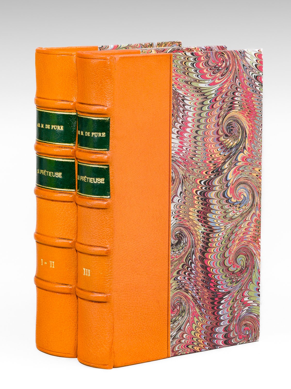 2 vol. in -12 rel. demi-chagrin orange, dos à 5 nerfs, couvertures conservées, texte publié d'après l'édition originale, avec une notice inédite sur l'abbé Pure, une bibliographie et des notes par Emile Magne, société des textes français modernes, Librairie Droz, Paris, 1938 et 1939, XCII-395 pp. et 344 pp. Bel exemplaire en très bon état. Peu courant ainsi relié.