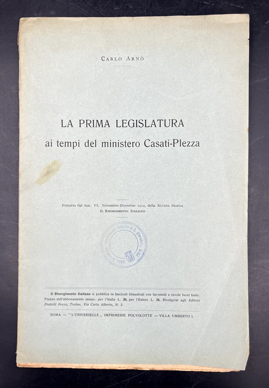 La PRIMA LEGISLATURA ai tempi del Ministero CASATI-PLEZZA. Estr. orig. da Rivista Storica Il Risorgimento Italiano, fasc. VI. nov.-dic. 1914.[su Gabrio Casati, Gioberti Ministro, Cavour, Pinelli, Sineo, tasse di guerra e STATUTO ALBERTINO]. ecc.)