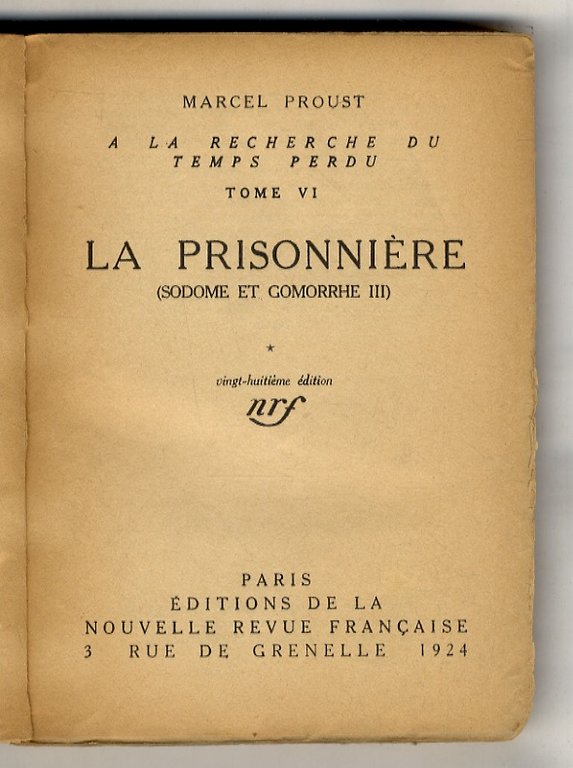 Paris, Editions de La Nouvelle Revue Française, 1924, in-8, br. fittizia, pp. 280, [2]. Sesto tomo della "Recherche".
