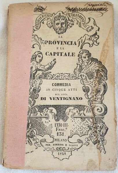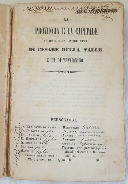 Edizione del 1848 del libretto "La provincia e la capitale" scritto dal librettista e scrittore di opere teatrali Cesare della Valle (1776/77-1860) Duca di Ventignano. Antiche note manoscritte in copertina, e nella lista dei personaggi. In discrete condizioni. Copertina editoriale in buone condizioni generali con lievi usure ai margini e dorso coperto da carta. Legatura in discrete condizioni con lievi rotture. All'interno le pagine si presentano in buone condizioni con rare fioriture. In 16. cm 15,5x10. Pp. 60 Edition of 1848 of the booklet "La provincia e la capitale" written by the booklet writer and playwriter Cesare della Valle (1776/77-1860) Duke of Ventignano. Antique handwritten notes in the cover and in the list of carachters. In fair conditions. Editorial cover in good general conditions lightly worn in the extremities and spine covered with paper. Binding in fair conditions with light cracks. Inside pages are in good conditions with occasional foxing. In 16. cm 15,5x10. Pp. 60<BR><BR>