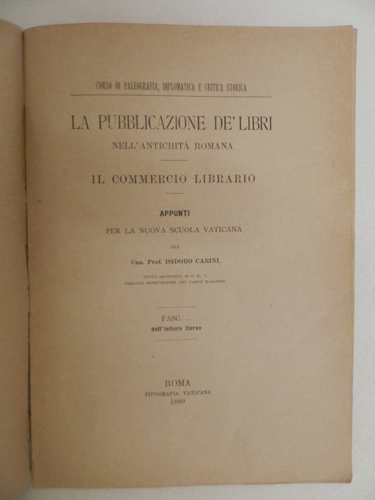 La pubblicazione de' libri nell'antichità romana. Il commercio librario. Appunti per la nuova scuola vaticana