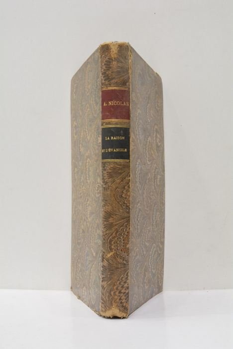 323 pages. 4 feuillets. Avertissement X. (23,5x14,5cm). Cartonnage ancien. Dos frotté. Coins et coiffes émoussés. Publié à Paris en 1876, cet ouvrage d'Auguste Nicolas aborde la relation entre la foi chrétienne et la rationalité, un sujet de grande importance à une époque marquée par les tensions entre la science moderne et les croyances religieuses. Nicolas, théologien et philosophe, s'efforce de réconcilier ces deux domaines apparemment divergents, en soulignant l'importance de l'éducation dans les universités catholiques comme moyen de promouvoir une compréhension harmonieuse entre la foi et la raison. Papier bruni et sali avec rousseurs éprses. Exemplaire partiallement non-coupé.