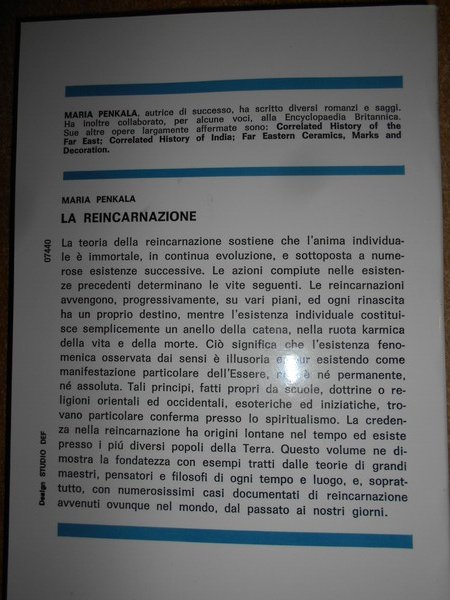 MARIA PENKALA. Roma, Edizioni Mediterranee, 1985. LA REINCARNAZIONE. Prove e dottrine di ogni tempo. In-8°, br. 206 pp. con figure in nero in tavole fuori testo. Come nuovo. Uff. stanzetta mob. piccolo a destra