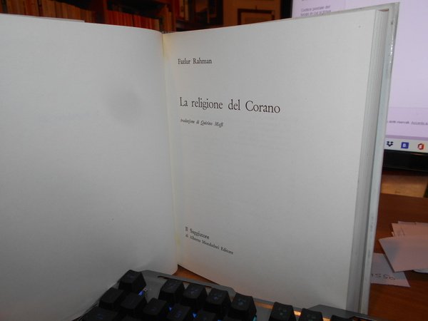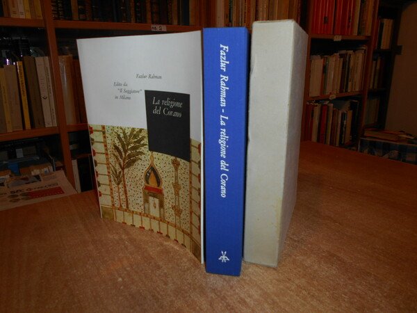 FAZLUR RAHMAN. Milano, Il Saggiatore, 1968. La Religione del Corano. Traduzione di Quirino Maffi. In-8°, tele edit. bleu con sdovracopertina ill. a col. 461 pp. con 56 tavole a colori e in bianco e nero. Ottimo esemplare con astuccio in cartoncino muto. Uff. stanz. TV. mob. nostro sinistra basso