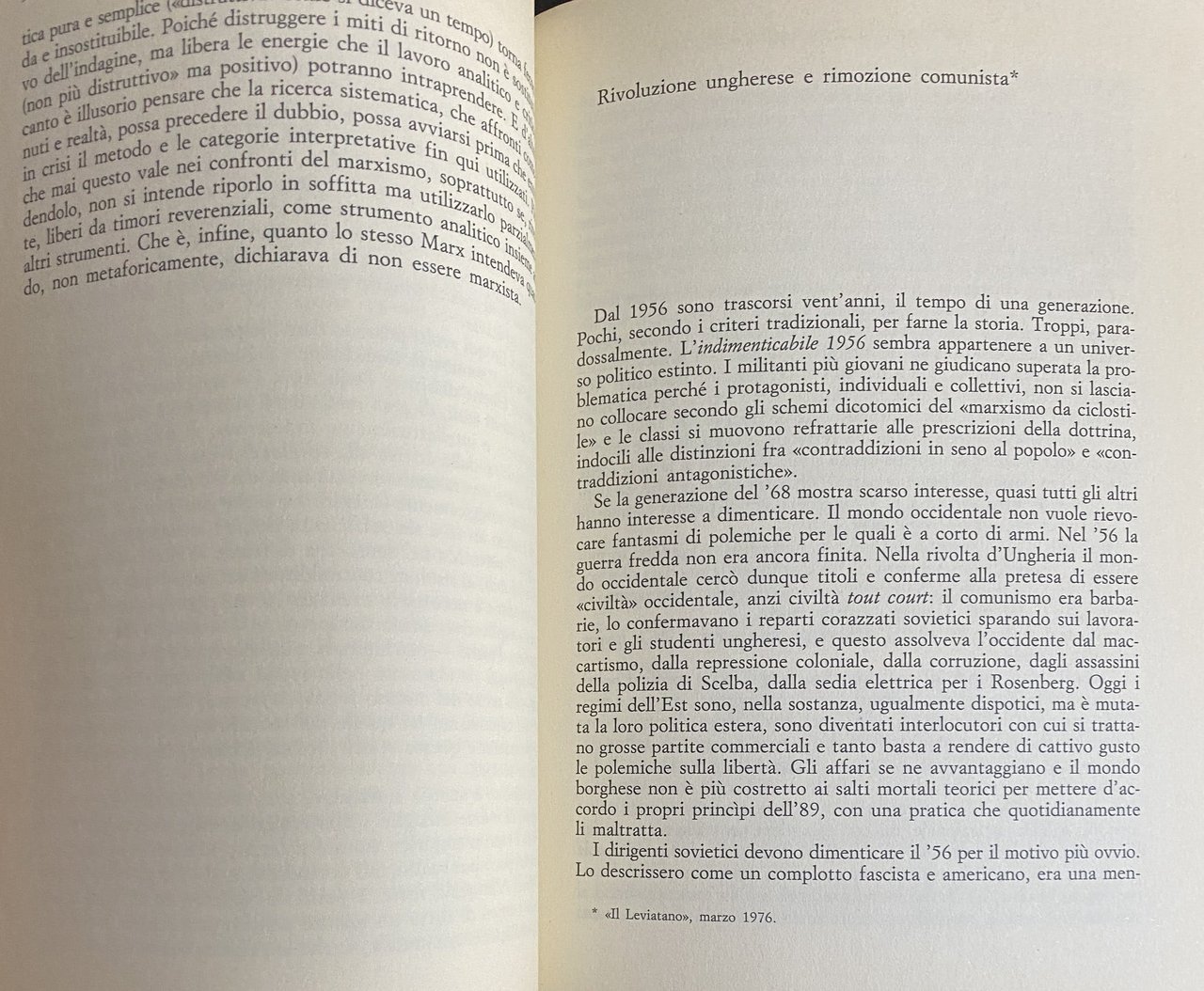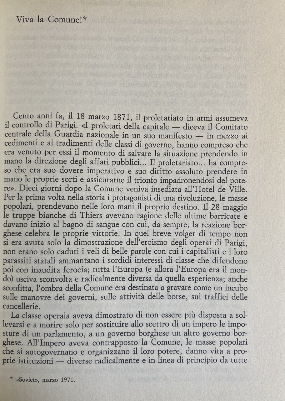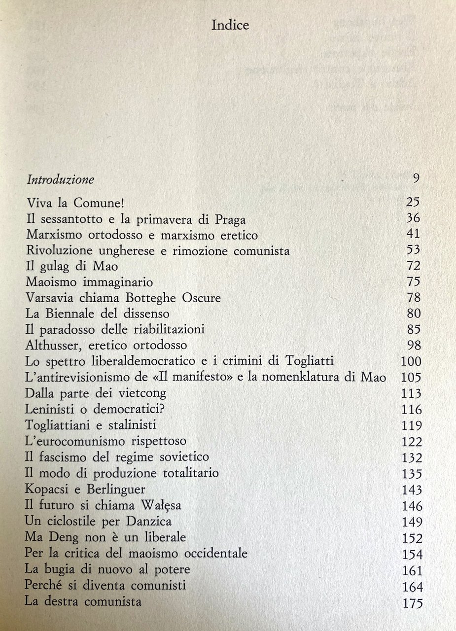 Soggetti: Politica Storia contemporanea Raccolte Scritti Antologie Filosofia Sinistra Partiti politici Ideologie politiche Politologia Ideologia Comune Parigi Socialismo Comunismo Rivolte Rivoluzioni Borghesia Proletariato Critica Masse Diritti sociali Sessantotto Primavera Praga Marxismo ortodosso eretico Ungheria Rivoluzione ungherese Lotta di classe Comunisti Gulag Mao Tse-Tung Cina Maoismo Varsavia Botteghe Oscure Dissenso Riabilitazioni Althusser Liberalismo Democrazia Crimini Togliatti Revisionismo Il manifesto Nomenklatura Vietcong Leninismo Socialdemocrazia Stalinismo Eurocomunismo rispettoso Fascismo Regime sovietico Produzione Totalitarismo Dittatura Collettivizzazione Proprietà Mezzi Lavoro Sfruttamento Merce Profitto Sciopero Sindacati Sindacalismo Movimento operaio Fabbriche Kopacsi Berlinguer Polonia Solidarnosc Lech Walesa Danzica Ma Deng Critica Potere Destra Wei Jingsheng Rimozione Italia Europa Francia Russia Cuba Agnelli Alatri Salvador Allende Amendola Hannah Arendt Aristotele Breznev Bucharin Camus Albert Asor Rosa Alberto Castoriadis Babeuf Baget Bozzo Berija Bettelheim Charles Bobbio Bocca Boffa Giuseppe Amadeo Bordiga Fidel Castro Chiaromonte Chruscev Bettino Craxi D'Alema Nando Dalla Chiesa De Gaulle Charles Biagio De Giovanni Galvano Della Volpe Deng Xiaoping Giuseppe Di Vittorio Dreyer Gomulka Antonio Gramsci Ruggiero Grieco Che Guevara Hegel Dubcek Agnes Heller Eliot Fassino Piero Jules Favre Ferrara Feuerbach Foa Vittorio Gabor Foldes Forlani Arnaldo Charles Fourier Francisco Franco Freud Sigmund Galli della Loggia Gide André Gierek Edward Giolitti Glucksmann André Hitchcock Hitler Ho Chi Min Husak Huxley Ingrao Jagielski Jang Qing Jensen Povl Bang Jingsheng Wej Nilde Jotti Janos Kadar Kautski Hans Kelsen Korsch Kossuth Kuron Jacek Merleau-Ponty Luciano Lama La Malfa Lefort Leonetti Lombardo Radice Longo Mussolini Imre Nagy Giorgio Napolitano Nasser Aldo Natoli Natta Rosa Luxemburg Nixon Maleter Malraux Novotny Occhetto Onofri George Orwell Marchesi Martinet Gilles Marx Pajetta Pannella Marco Ferruccio Parri Molotov Montanelli Modzelewski Rodolfo Morandi Alberto Moravia Egdar Morin Mossadeq Pellicani Pertini Ota Šik Ignazio Silone Pinochet Pintor Piovene Pol Pot Pomian Popper Procacci Proudhon Radek Camilla Ravera Edgar Snow Solzenicyn Aleksander Pietro Spriano Strada Vittorio Tasca Angelo Umberto Terracini Rosenberg Thiers Rossanda Rossana Rosselli Russell Sacharov Salvadori Sartre Scelba Mario Sciascia Secchia Pietro Thorez Maurice Tito Trentin Bruno Tresso Trochu Trockij Trombadori Uhl Petr Valiani Valletta Vidali Visentini Vysinskij Weber Max Yannakakis Yao Wenyuan Zaccagnini Zdanov Zinov'ev Elezioni Riformismo Economia Capitalismo PCI Bolscevichi Borghese Budapest Burocrazia Cecoslovacchia Centralismo Classe operaia Contraddizioni Crisi Dazibao Est Urss Dirigenti Diritto Opposizione Parlamento Giustizia Dissidenti Governo Kronstadt Eurocomunismo Lavoratori Legittimità Libertà Libertarismo Masse Popolare Militanti Monopolio Polemica Reazionari Sconfitta Studenti Teoria Trozkista Articoli Elzeviri Stampa editoria Censura Propaganda Vietnam Carraramtai Tienanmen 1956 Guerra L'Unità Repubblica Biennale Dibattiti Congresso Anni Settanta Terrorismo Brigate Rosse Lotta armata Editori Riuniti L'Avanti Diseguaglianza Ricchezza Politics Contemporary history Collections Writings Anthologies Philosophy Left Political parties Political ideologies Political science Socialism Communism Revolts Revolutions Bourgeoisie Proletariat Social rights Sixty-eight Marxism Revolution Class struggle Communists Dissent Liberalism Democracy Crimes Revisionism Social democracy Fascism Totalitarianism Dictatorship Property Work Exploitation Trade unions Workers' movement Factories Criticism Power Right Elections Reformism Economy Capitalism Bureaucracy Opposition Justice Dissidents Government Eurocommunism Freedom Masses Militants Articles Press publishing Censorship Debates Congress Seventies Inequality
