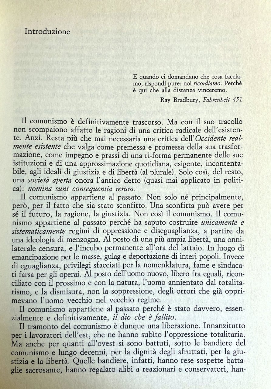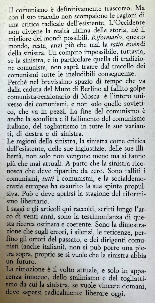 Il comunismo è definitivamente trascorso. Ma con il suo tracollo non scompaiono le ragioni di una critica radicale dell'esistente. L'Occidente non diviene la realtà ultima della storia, né il migliore dei mondi possibili. Riformarlo, questo mondo, resta anzi più che mai la ratio essendi della sinistra. Un compito impossibile, tuttavia, se la sinistra, e in particolare quella di tradizione comunista, non saprà trarre dal tracollo dei comunismi tutte le ineludibili conseguenze. Perché nel brevissimo spazio di tempo che va dalla caduta del Muro di Berlino al fallito golpe comunista-reazionario di Mosca è l'intero universo dei comunismi, e non solo quello sovietico, che va in pezzi. La fine del comunismo è anche la sconfitta e il fallimento del comunismo italiano, del togliattismo in tutte le sue varianti, di destra e di sinistra. Le ragioni della sinistra, la sinistra come critica dell'esistente, delle sue ingiustizie, delle sue illibertà, non solo non vengono meno ma si fanno più che mai attuali. A patto che la sinistra riconosca che deve ripartire da zero. Sono falliti i comunismi, tutti i comunismi, e la socialdemocrazia europea ha esaurito la sua spinta propulsiva. Può e deve aprirsi la stagione del riformismo libertario. I saggi e gli articoli qui raccolti, scritti lungo l'arco di venti anni, sono la testimonianza di questa ricerca ostinata e coerente. Sono la dimostrazione che sugli errori, i silenzi, le reticenze, perfino gli orrori del passato, e dei dirigenti comunisti (anche italiani), non si può porre una pietra sopra, proprio se si vuole che la sinistra abbia un futuro. La rimozione è il volto attuale, e solo in apparenza innocuo, dello stalinismo e del togliattismo da cui la sinistra, se vuole vincere domani, deve sapersi radicalmente liberare oggi.