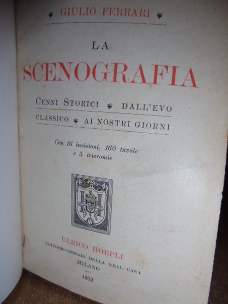 FERRARI, Giulio - Milano, U. Hoepli, 1902. Cenni storici dall' evo classico ai nostri giorni. In-16°, m. pergamena amatoriale, dorso a nervi, doppio tassello, larghe punte. xxiv, 326, (2) pp. con 16 incisioni n.t. e 165 tavole f.t. delle quali 5 in tricromia. Uno dei rari manuali Hoepli importante anche dal punto di vista bibliografico. Bell' esemplare.
