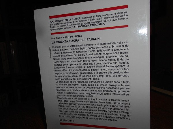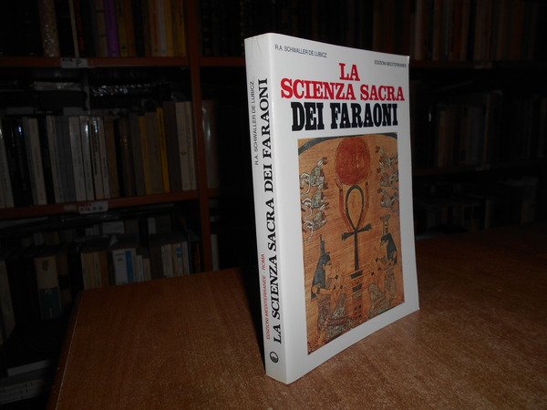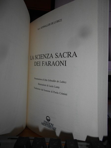R.A. SCHWALLER De LUBICZ. Roma, Edizioni Mediterranee, 1994. La Scienza Sacra dei Faraoni. Presentazione di Isha Schwaller de Lubicz. Illustrazioni di Lucie Lamy. Traduzione dal francese di Paola Crimini. In-8°, br. ill. a col. 271 pp. con illustrazioni n.t. Come nuovo. Uff. stanzetta mob. a sinistra